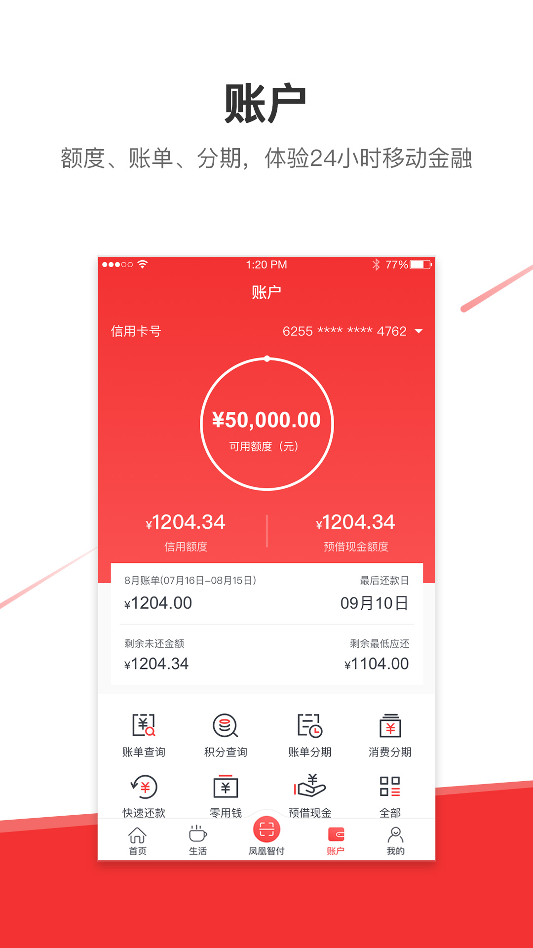 凤凰信用卡是北京农商银行信用卡官方客户端,其致力于为广大持卡人提供全年无休、7*24小时不间断的信用卡服务。它具备诸多主要功能,像账户查询功能,能让您随时了解信用卡账户的相关情况;还款功能方便您及时偿还信用卡欠款;分期功能可满足您不同的资金分期需求;卡片管理功能助力您更好地管理信用卡;密码管理功能保障您信用卡使用的安全性;支付管理功能使您的支付过程更加便捷;账单管理功能让您清晰掌握信用卡账单信息;积分查询及兑换功能,您可查询积分并进行兑换;还有转账转出功能等。同时,凤凰信用卡为您精心打造多种多样丰富多彩的活动,提供诸多权益,帮助您累积信用,畅享绿色生活。
