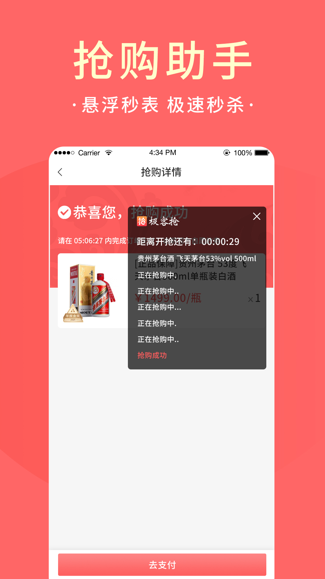 极客抢是由北京水木畅想网络科技有限公司推出的一款自动点击秒杀抢购助手。它在茅台自动定时秒杀方面表现出色,其悬浮秒杀功能让抢购速度快人一步!