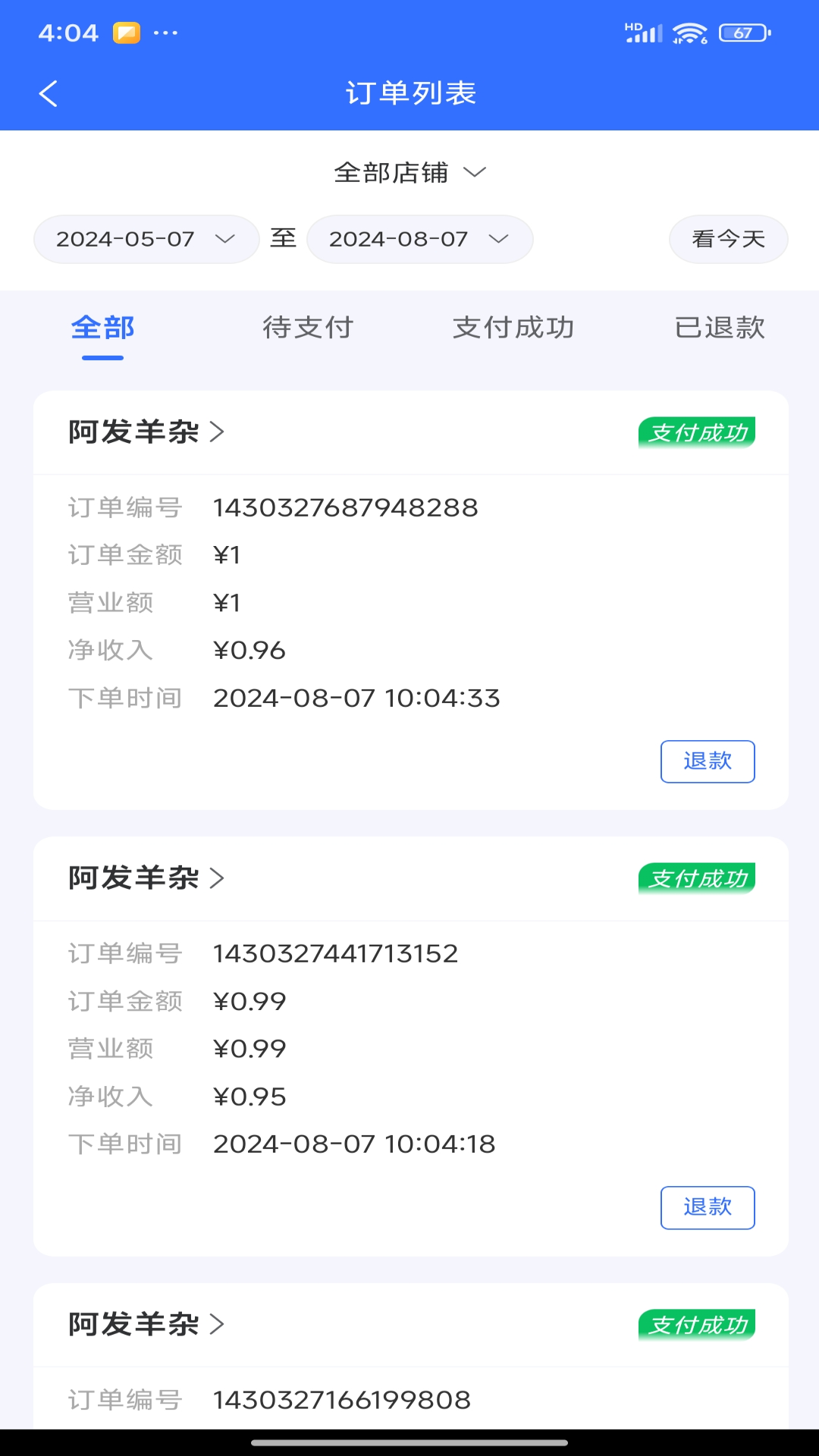 店铺记账得力助手 登录商家App管理在线订单,可查看订单流水、日收益、订单的支付金额、营业额、净收入等数据,各维度统计报表的展示。