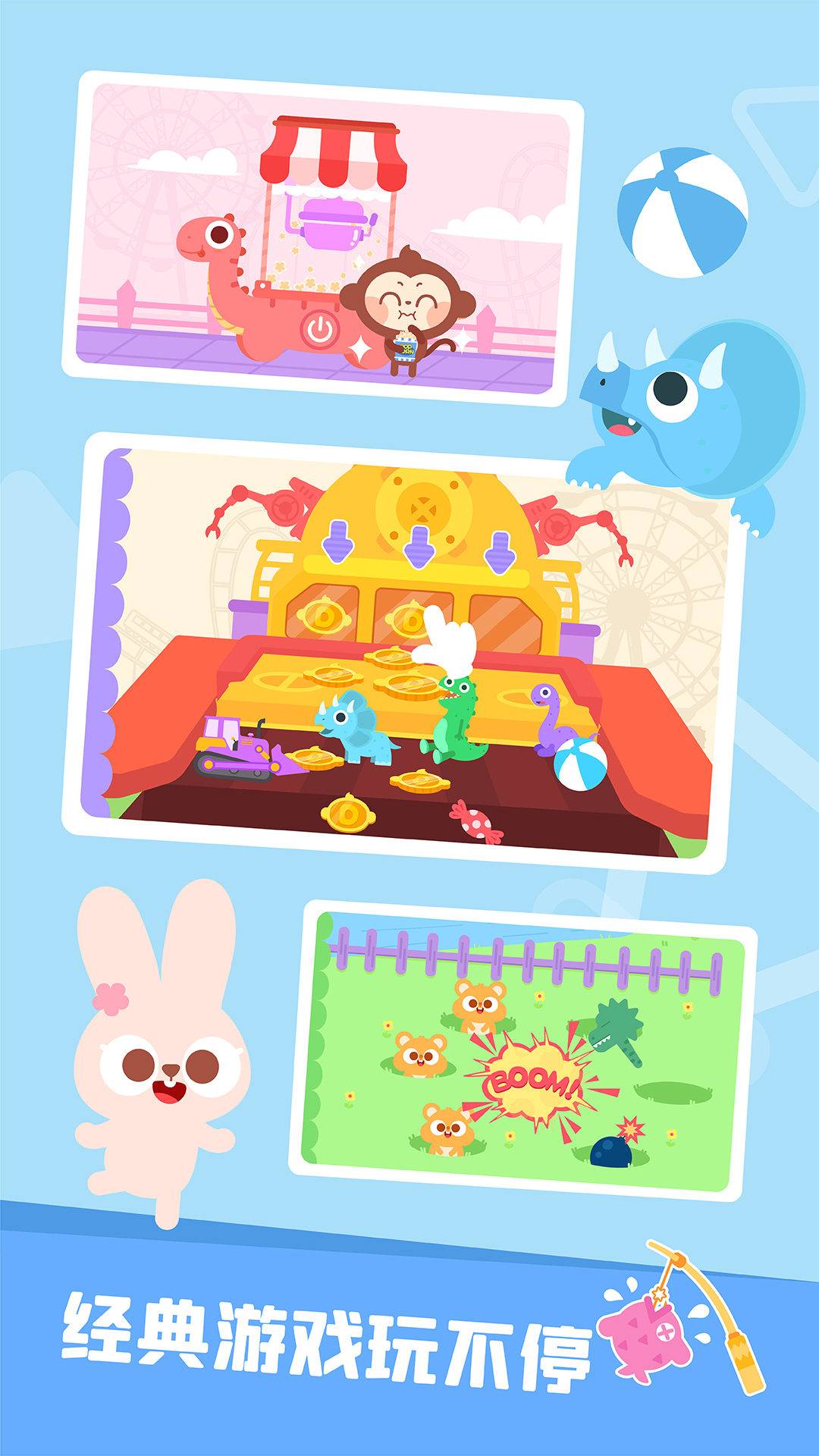快来【多多恐龙乐园】玩耍呀,这里有超多充满乐趣的游乐园项目在等着你们哦!这里真实地还原了儿童游乐园里的娱乐设施,像打地鼠、钓鱼机、推金币、恐龙转转转等等,那些经典的游乐园项目,你们都可以尽情畅玩呢!