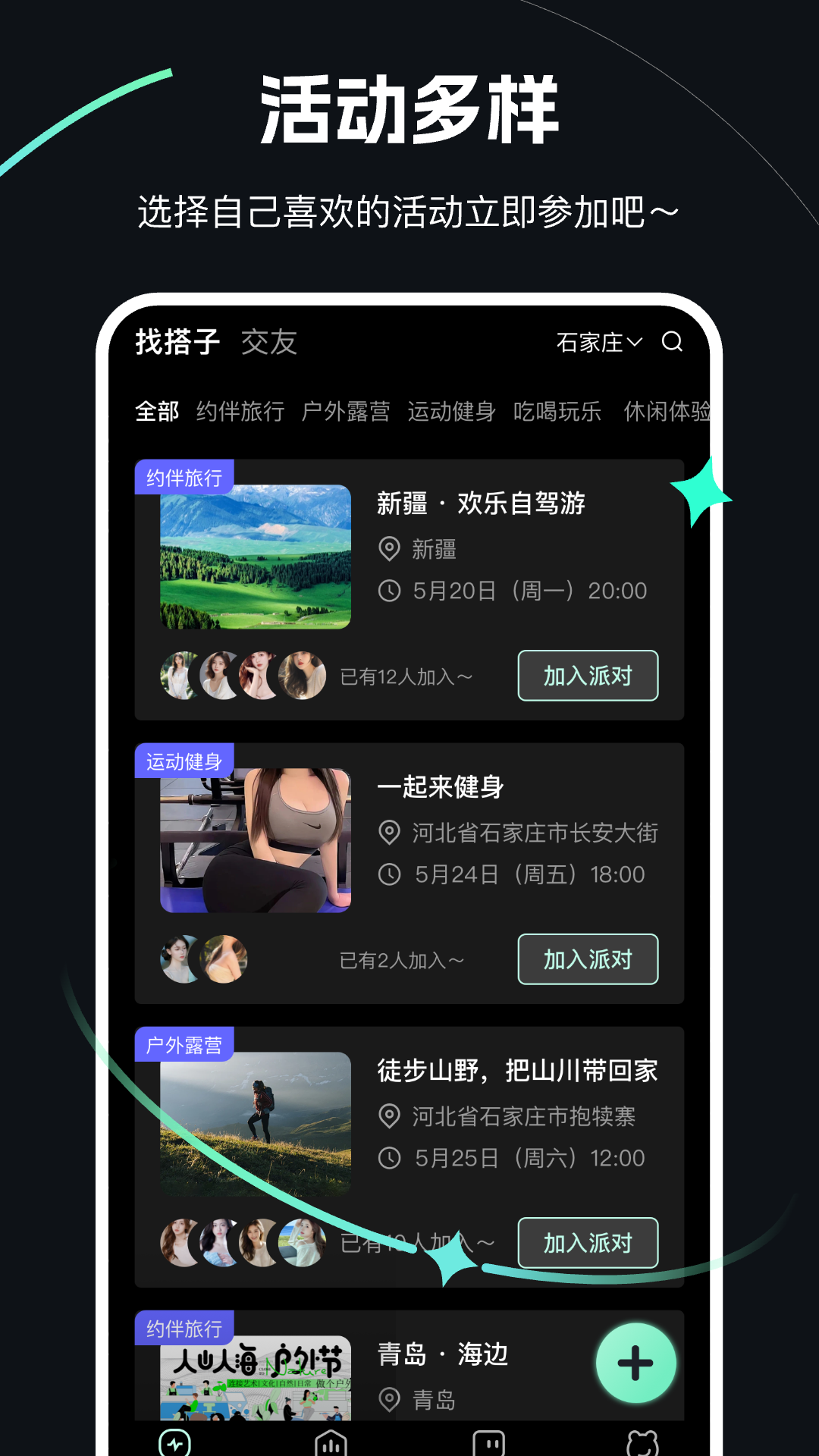 「活动报名」用户可以参与平台举办的各种线下活动,如单身旅行、派对、露营、运动等,通过报名参与活动详情,了解参与人员信息。