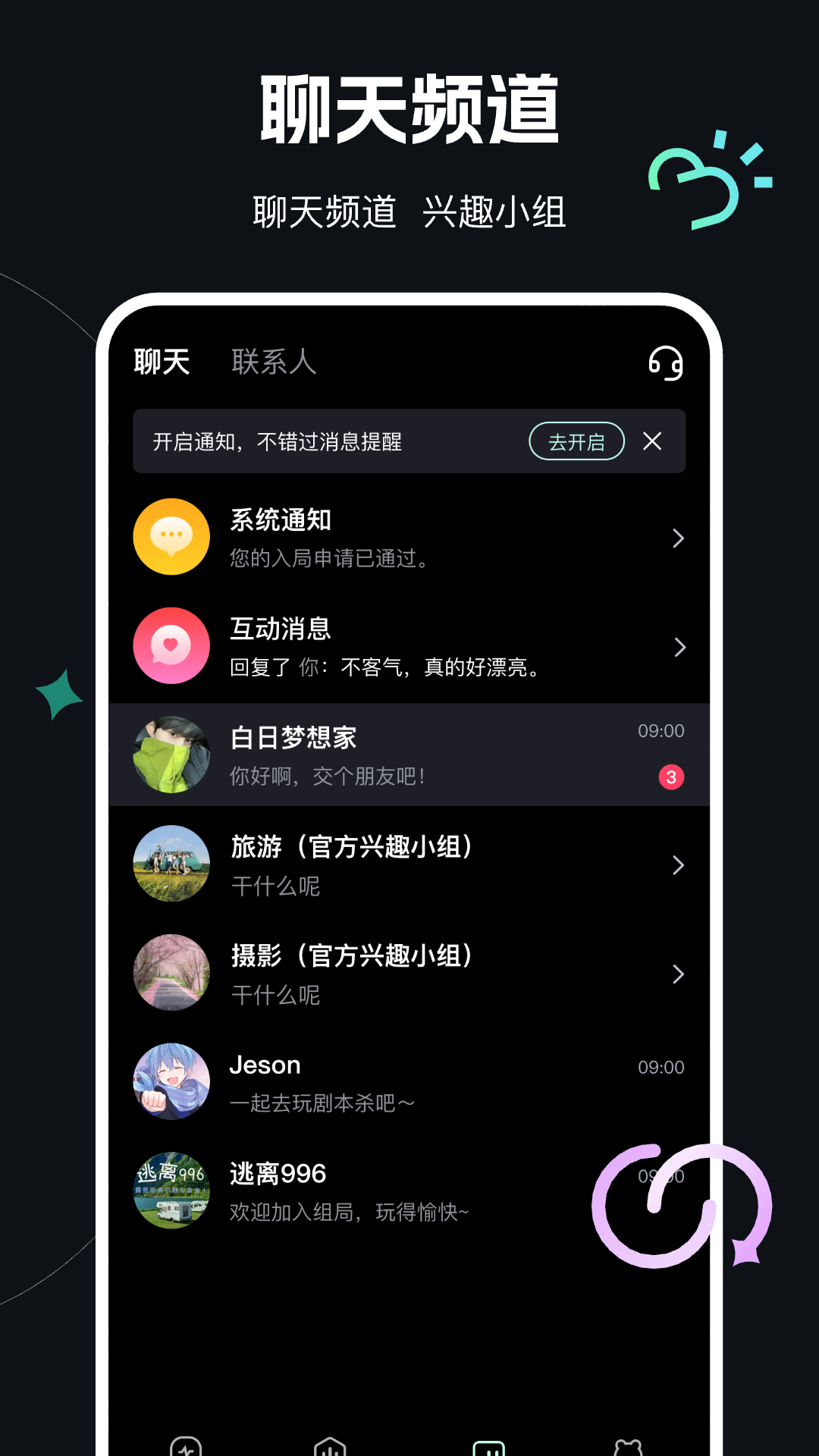 「私信聊天」用户与其他用户可以进行聊天,增进彼此的亲密度。同时,平台还设有聊天室,方便多人交流沟通。
