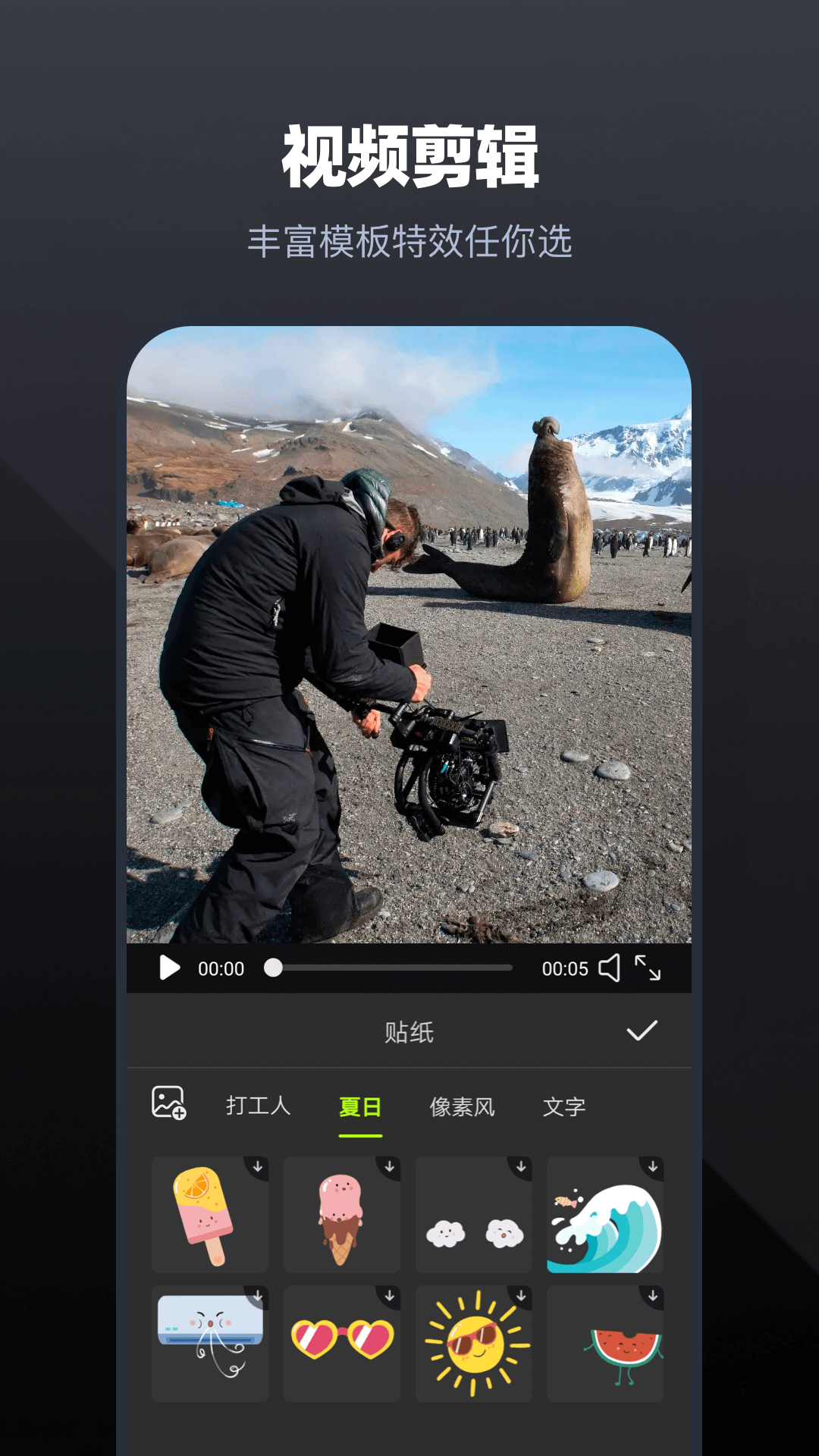 而在视频编辑功能上,它包含剪辑、音频、贴纸、文字、画中画、特效、滤镜、缩放比例、添加背景等诸多内容。