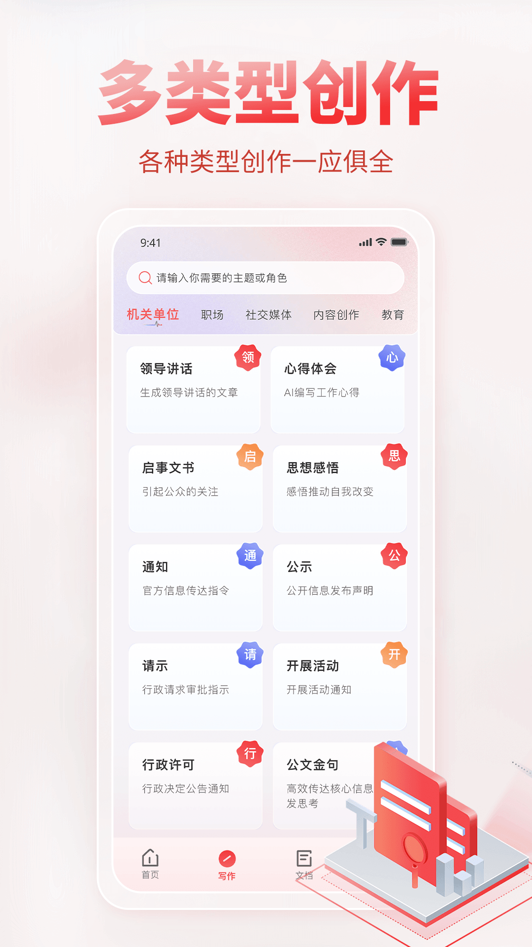 4. 实用办公功能:除了关键的公文写作功能之外,AI公文写作器还提供在线办公、法定公文固定模板等实用的功能,全方位提高您的办公效率。