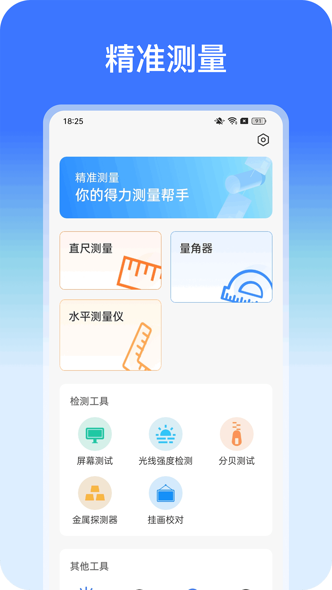 精准测量app有多款小工具的集合,它包含尺子、分贝仪、量角器、水平仪、指南针、手电筒等功能。 【功能介绍】 1.量角器 简明量角器,可实现角度随意进行切换,对实物拍照后进行测量器角度。 2.尺子 以手机边长作为测量刻度,测量物体长宽。 3.分贝仪 测量周边环境噪音分贝值,本功能可以测试噪音的分贝,透过噪音测试仪测试是否在一个嘈杂的环境中。 4.辅助挂画、挂对联, 实现挂置物体是否是在一个水平的位置,帮助强迫症实现没有误差。 5.指南针 快速定位辨别方向东南西北角度测量