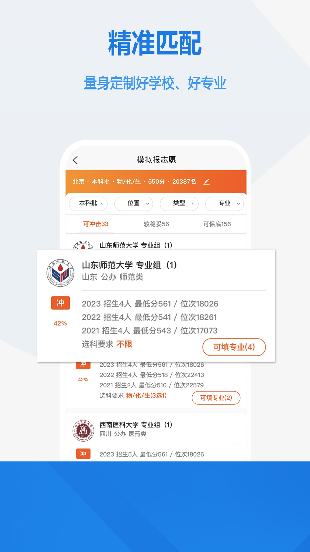 高考志愿手册是针对高考生的志愿填报指导平台,根据考试院的历年升学数据,结合智能推荐算法,推荐录取率高的院校。科学填报志愿,降低填报风险,堪称高考直通车。