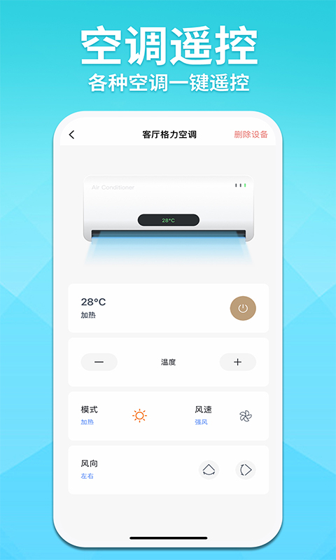 这是一款适用于各种智能家电的手机遥控器——空调智能遥控器王。仅需连接一个红外设备,就能操控多种品牌的空调、电视、投影仪等智能家居设备,旨在助力用户对各类电器设备的遥控功能进行管理。