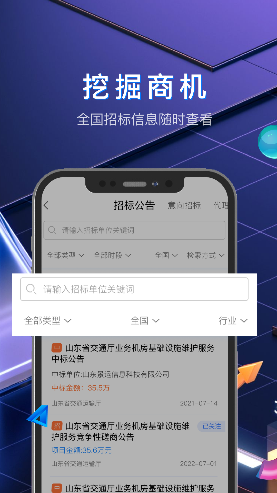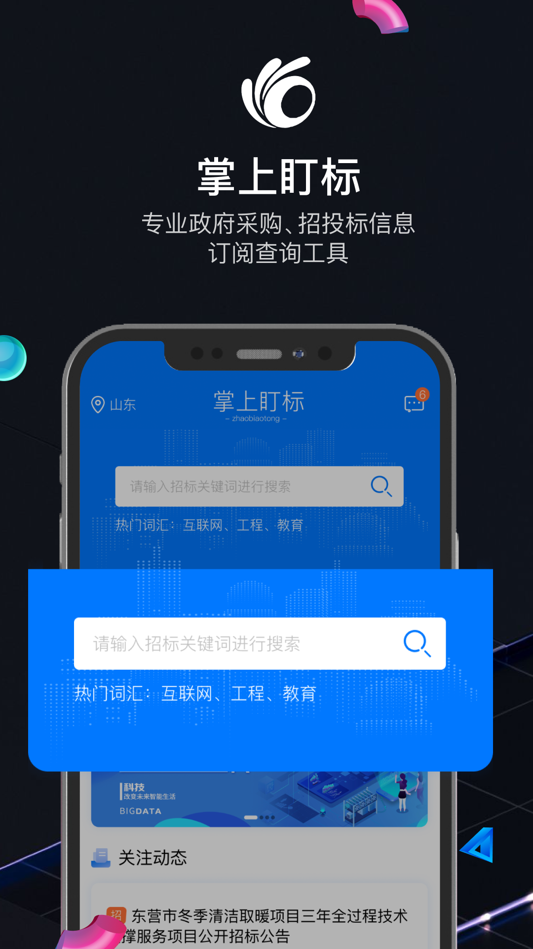 掌上盯标,政府采招行业专业平台,招标查询,招标推送,投标单位信息,中标信息,政府单位采招实时动态,让您随时随地掌握商机。