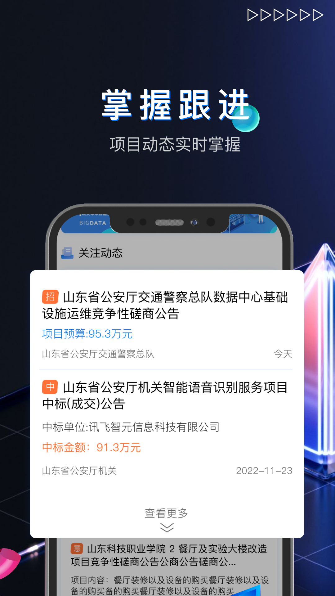 掌上盯标是一款精准实时推送政府招投标采购信息服务平台,目前汇聚山东省各级政府招标预告、招标公告、中标信息、招标变更信息、拟建项目等招标采购信息,专注互联网+招投标行业的大数据服务,为您提供全面的招标、投标、采购等招投标数据。