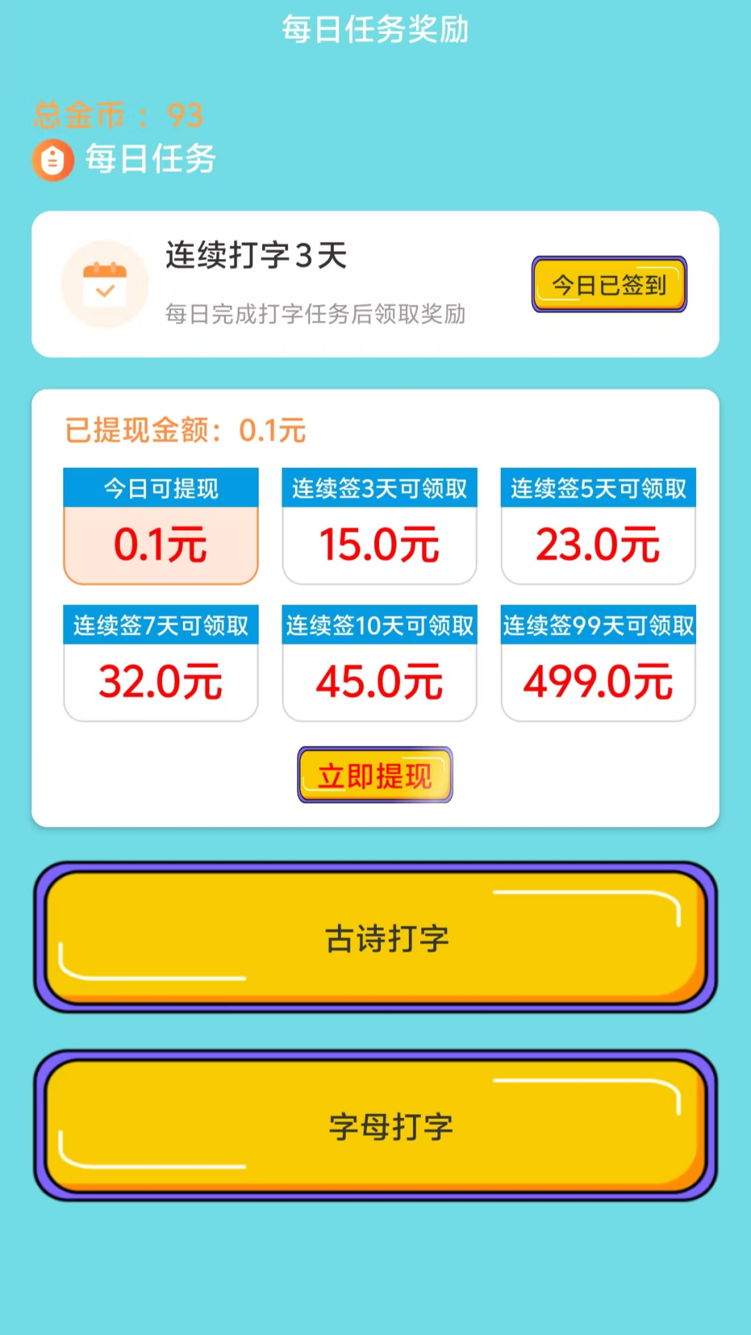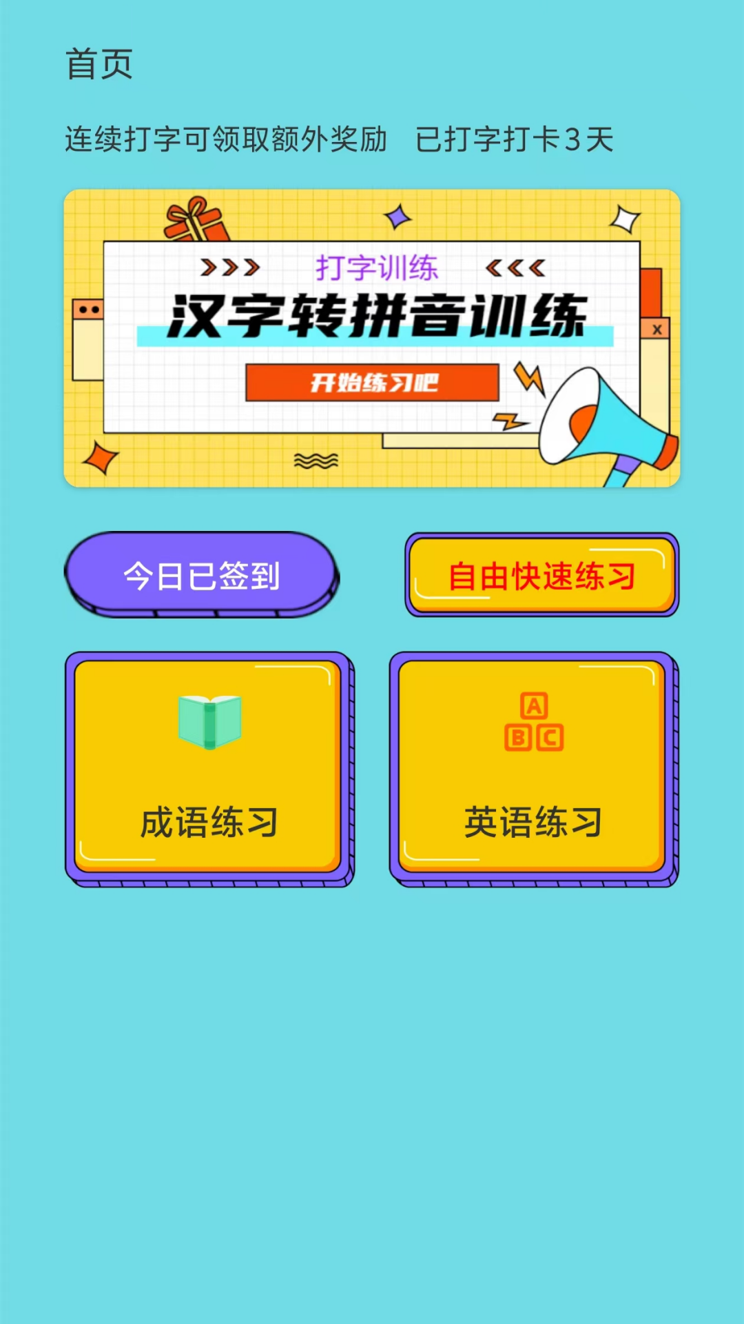 打字赚钱录入练是一款在线打字练习软件。在这里,你可以进行多种类型的打字练习,像是成语打字练习、英语打字练习、古诗文打字练习以及字母打字练习等。它还具备汉字转拼音的功能,能让使用者快速掌握中文发音规则。更为诱人的是,当你在进行打字练习的时候,还能够领取奖励哦。