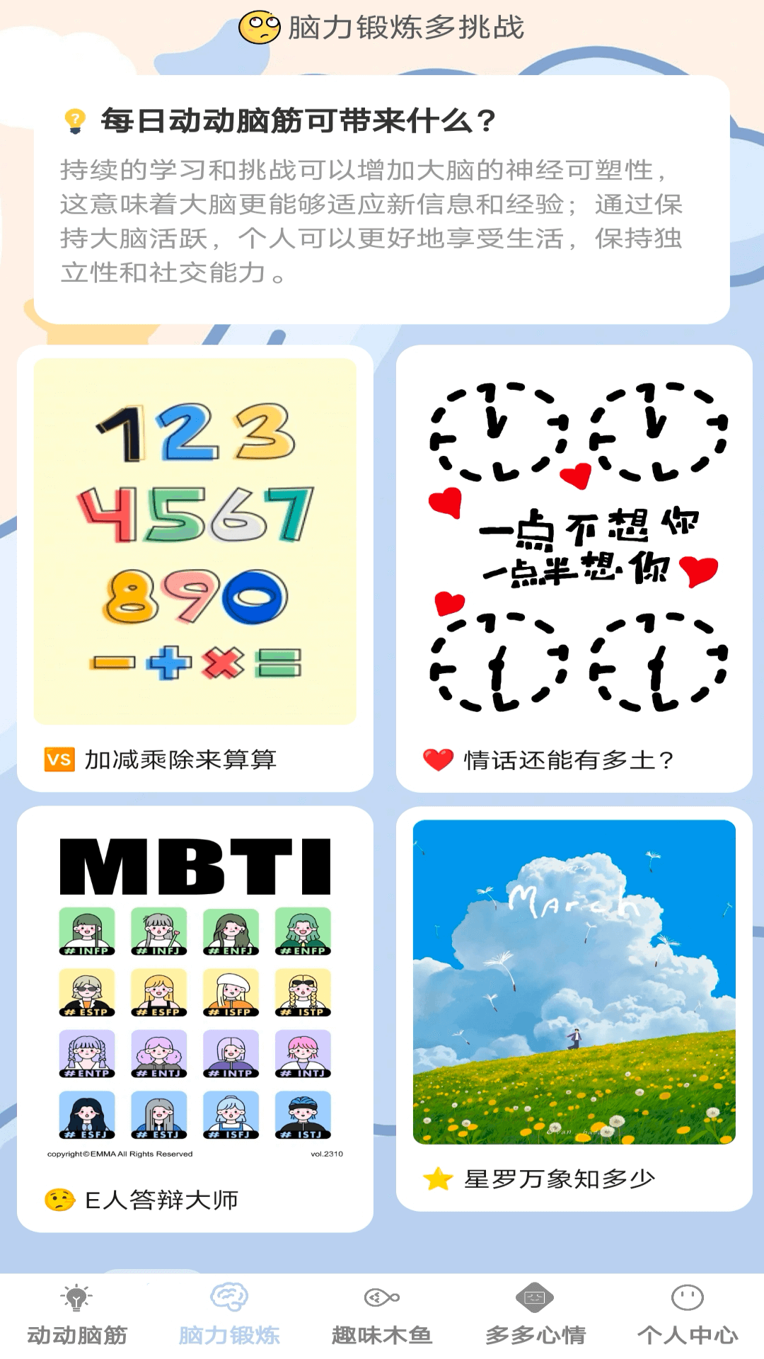 在【脑力趣挑战】这个平台,它能让你超越平凡的认知界限,每一次点击都会成为智慧与乐趣的美妙相遇。在这里,你不只是在接受挑战,更是在创造独属于自己的缤纷多彩的记忆。快来加入我们吧,在这里,每一天都将是充满新奇与惊喜的盛宴!