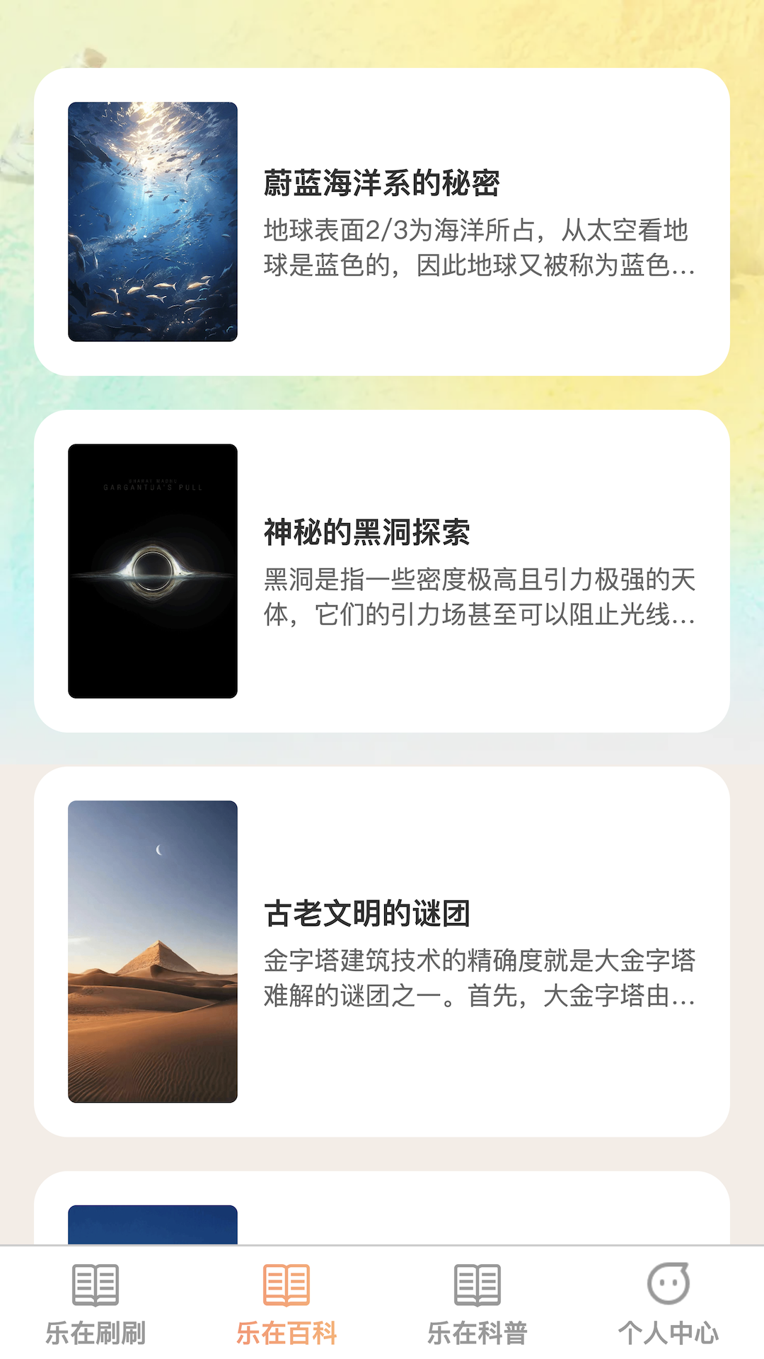 【乐在百科】集结了丰富多样的百科内容,如古老文明的未解之谜、黑洞的神秘探险等,让您在了解世界的同时,激发出对知识与科学的浓厚兴趣。