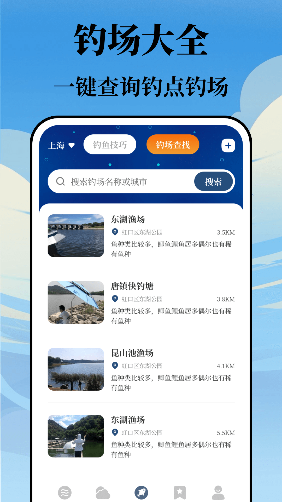 通过输入关键词或者地理信息,就能查询周边的钓点和钓场。