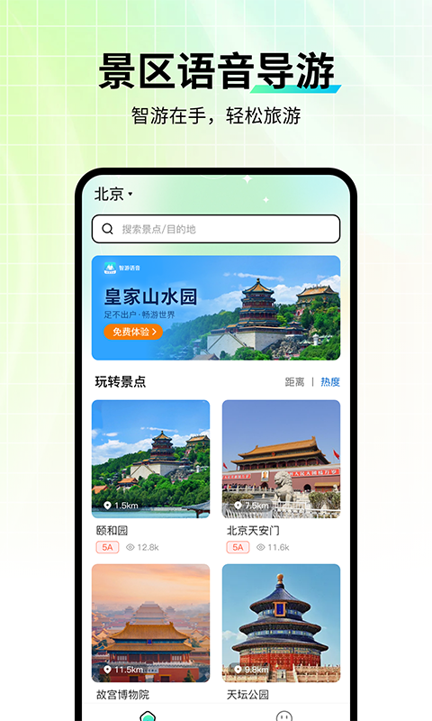 它提供景区自动导览服务,旨在为您打造高品质的旅行体验。您既能够按照城市查看景区列表,也可以搜索自己感兴趣的景区来获取相关信息。当您到达景区后,开启自动导览模式,智游语音会依据您当下的地理位置信息,为您智能讲解并规划路线,全方位保障您高品质的旅行出行。