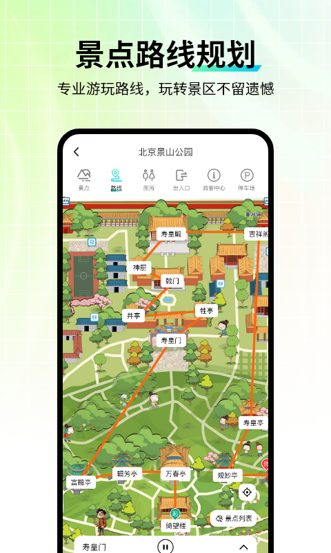 景区内的路线规划功能十分强大,能够帮助您找到想去的景点、出入口、卫生间、游客中心、停车场等设施,使您的旅行更加便捷舒适,尽情享受无忧无虑的旅行过程。