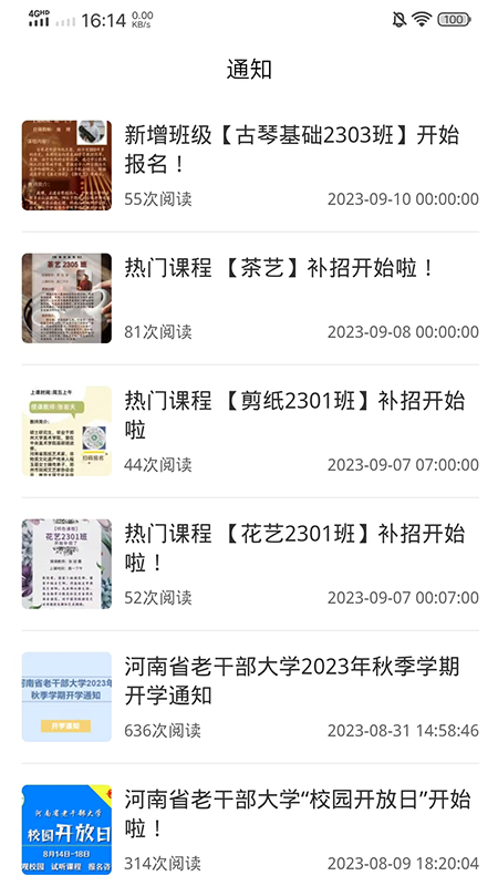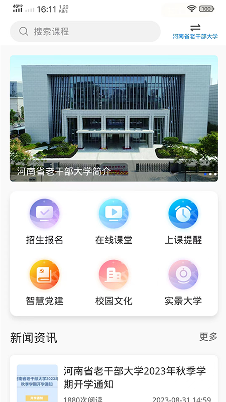 河南省老干部大学的手机APP客户端是专门针对老年学员开发的综合式老年教育服务平台。该平台集招生报名、在线学习、资讯收发以及信息查询等功能于一体。