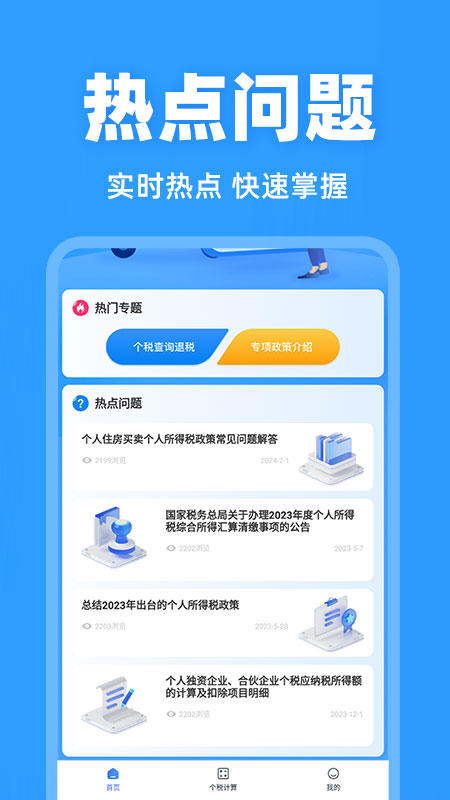 - 该应用会实时对国家税务局发布的税法政策及相关解读进行更新,使您能及时知晓专项政策的介绍内容,从而解答您在个人所得税方面存在的疑惑。