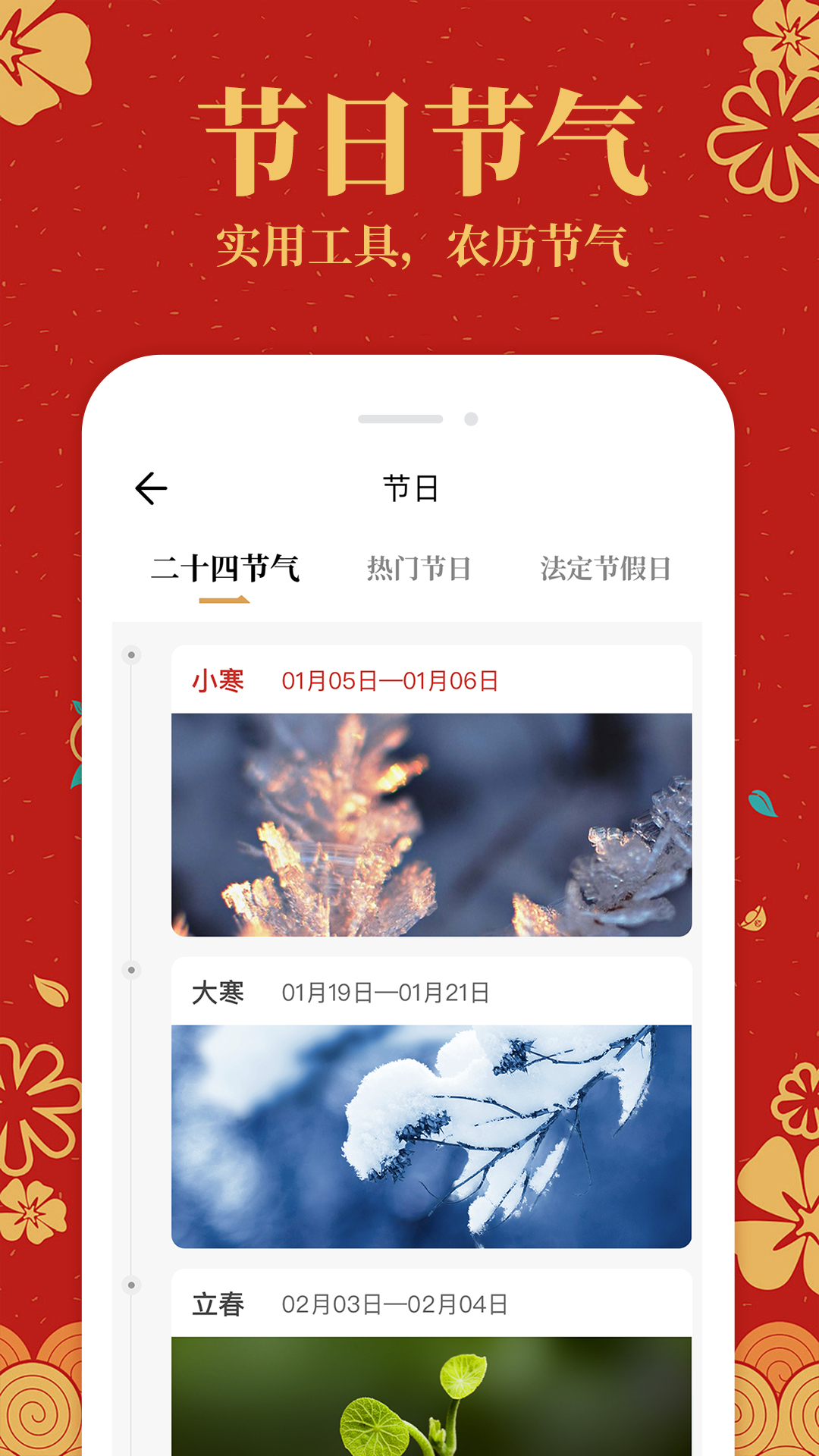 1、日历:随时掌握黄道吉日、生肖运势、节日节气;