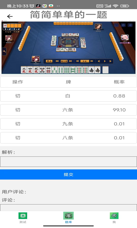 1. 立直麻将题库包含数以千计的切牌试题哦。这里的AI会给出排名靠前的切牌的概率,并且有专家对AI的切牌数据进行剖析解读呢。