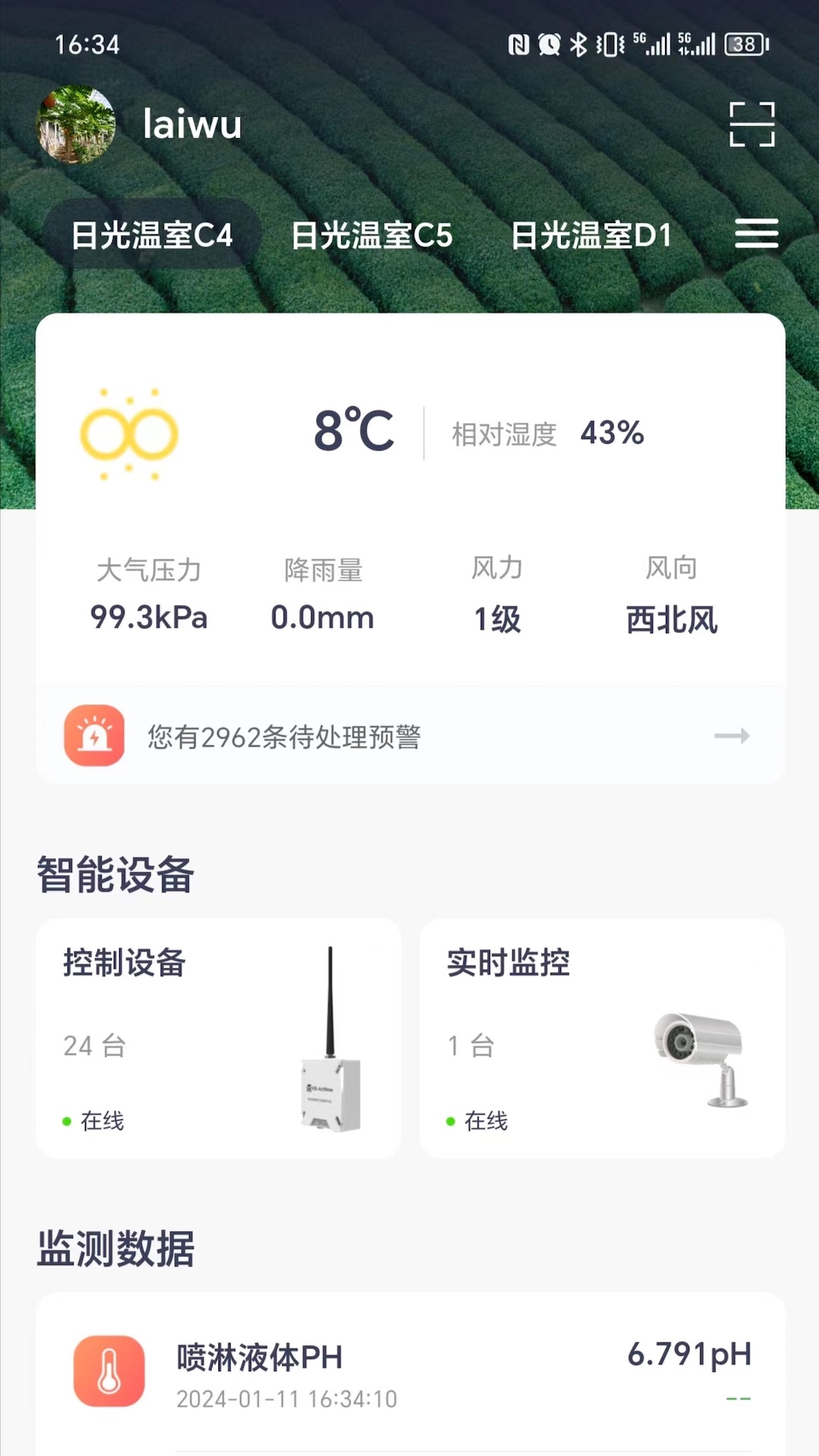 用户可以通过移动和PC等终端随时随地登陆自己专属的网络客户端,访问田间的实时数据并进行系统管理,对每个监测点的环境、气象、作物生长情况等各种数据进行实时监测。