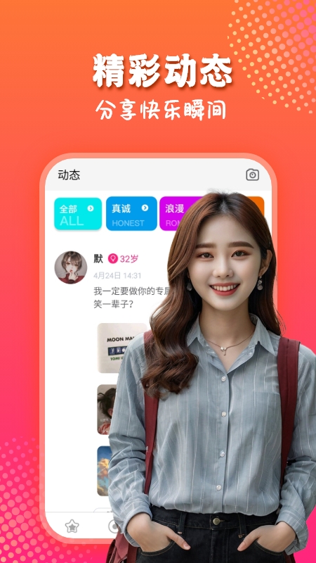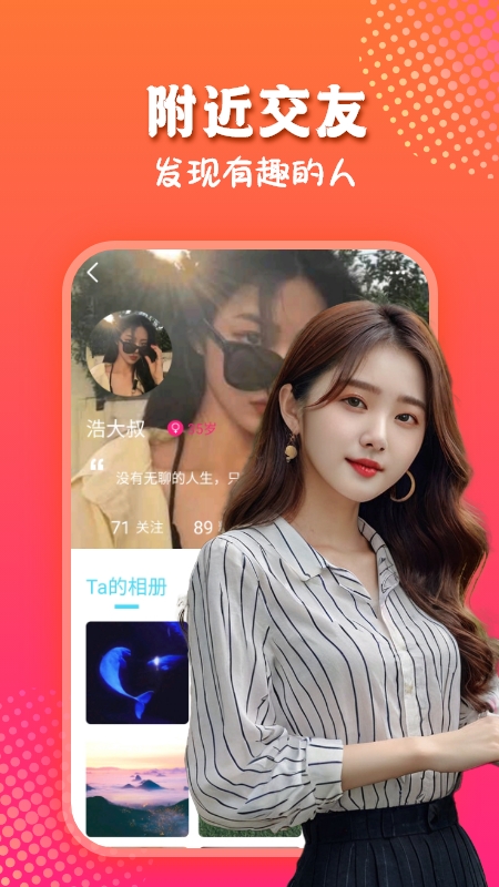 【同城交友】:提供独特的附近交友方式,让您随时随地发现同城的有缘之人,一起尽情享受这座城市带来的乐趣。