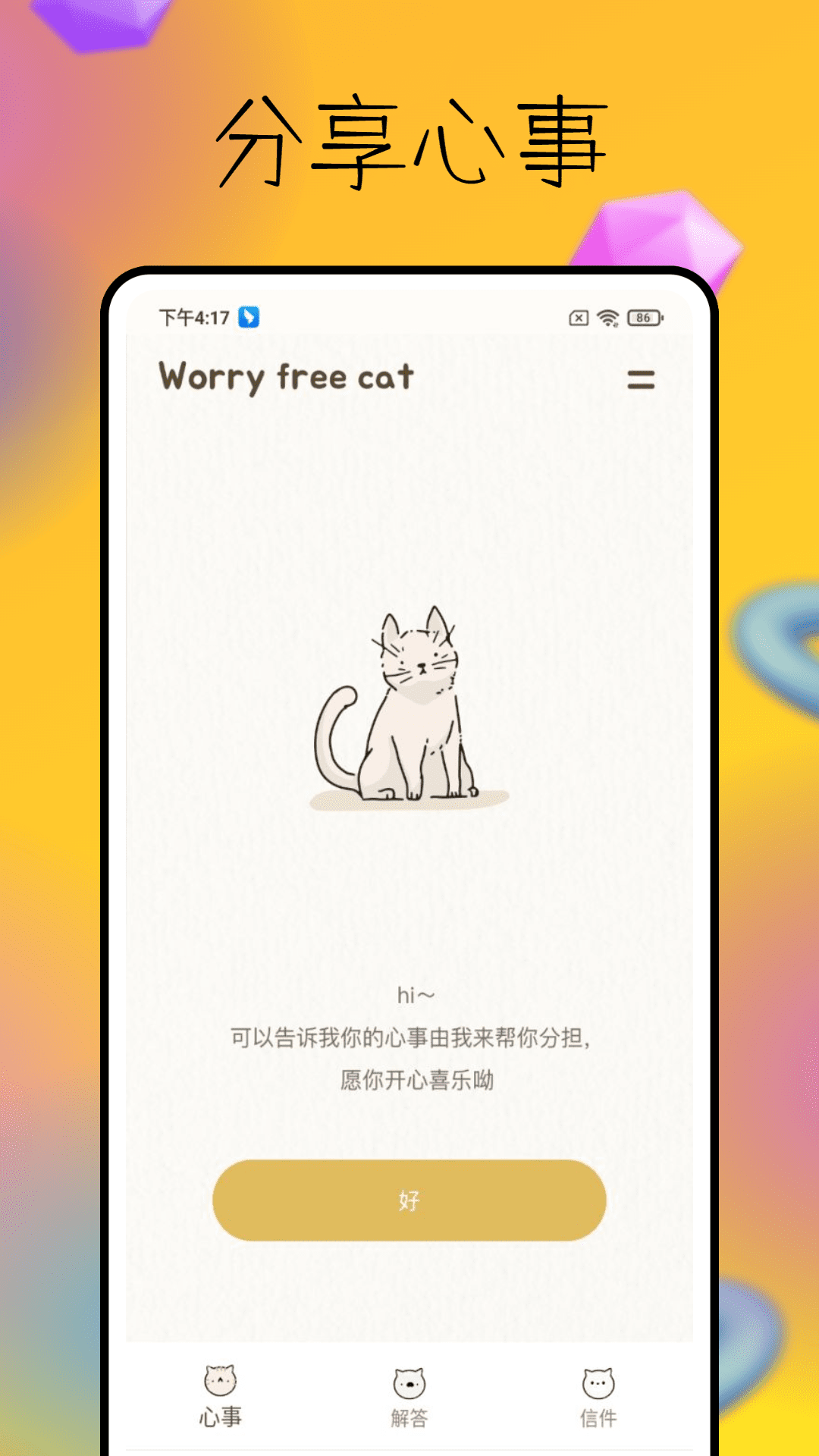 Bunble,宛如您专属的私人树洞和解答宝典。在这个空间里,您能够尽情放飞自己的心灵,把心底的那些事儿用文字倾诉出来,让内心压抑的情绪得到释放。而且,我们的“答案之书”会针对您的困惑给予充满智慧的引导,每一次的点击或许都能成为一次心灵被启迪的契机。除此之外,Bunble还具备方便的收信和写信功能,借助这个功能,您可以和亲朋好友维系紧密的联系。快来体验Bunble吧,它会让您的生活变得更加轻松惬意!