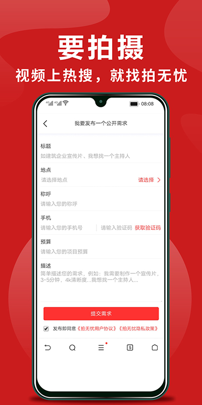 拍无忧,作为国内首屈一指的视频交易服务平台,汇聚整合了来自全国各地的优质拍摄团队资源,以及涵盖多种类型的视频拍摄需求资源,像全国企业宣传片、抖音短视频、抖音代运营、婚纱摄影、全国tvc广告拍摄、动画制作(包括mg动画)、全国影视制作等各类视频相关资源,是国内提供一站式服务的平台。