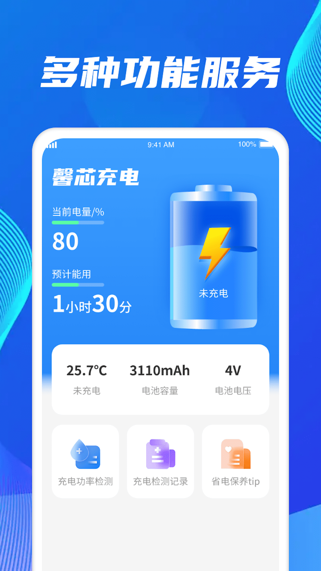 馨芯充电APP作为充电助手,能够让使用者清楚知晓手机的充电功率、电压等数据,以此保证手机是在安全的充电范围之内充电的。