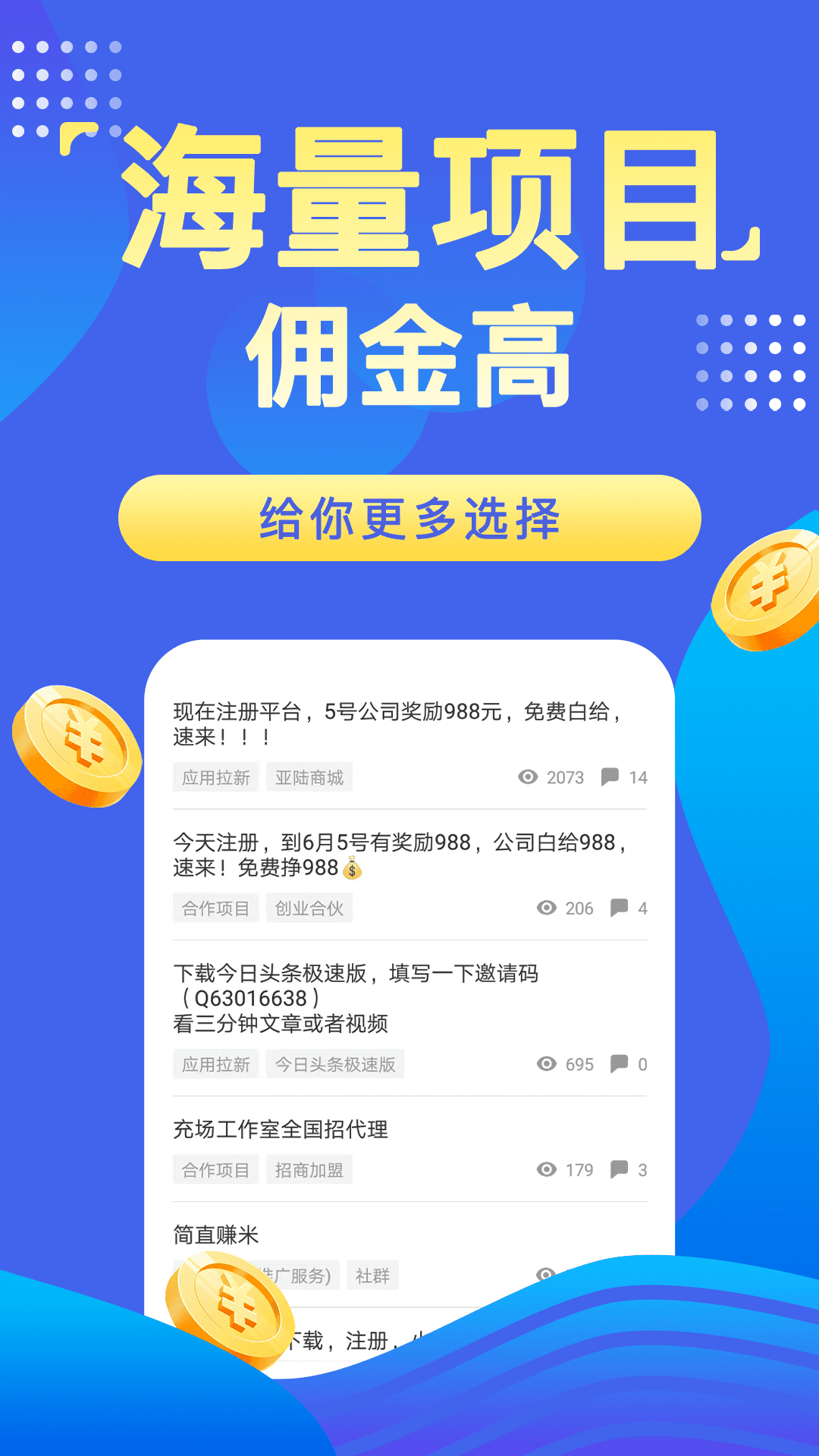 免费发布:大象赚钱为从事APP推广拉新的网推和地推 人员提供了一个免费拓展合作的地方。