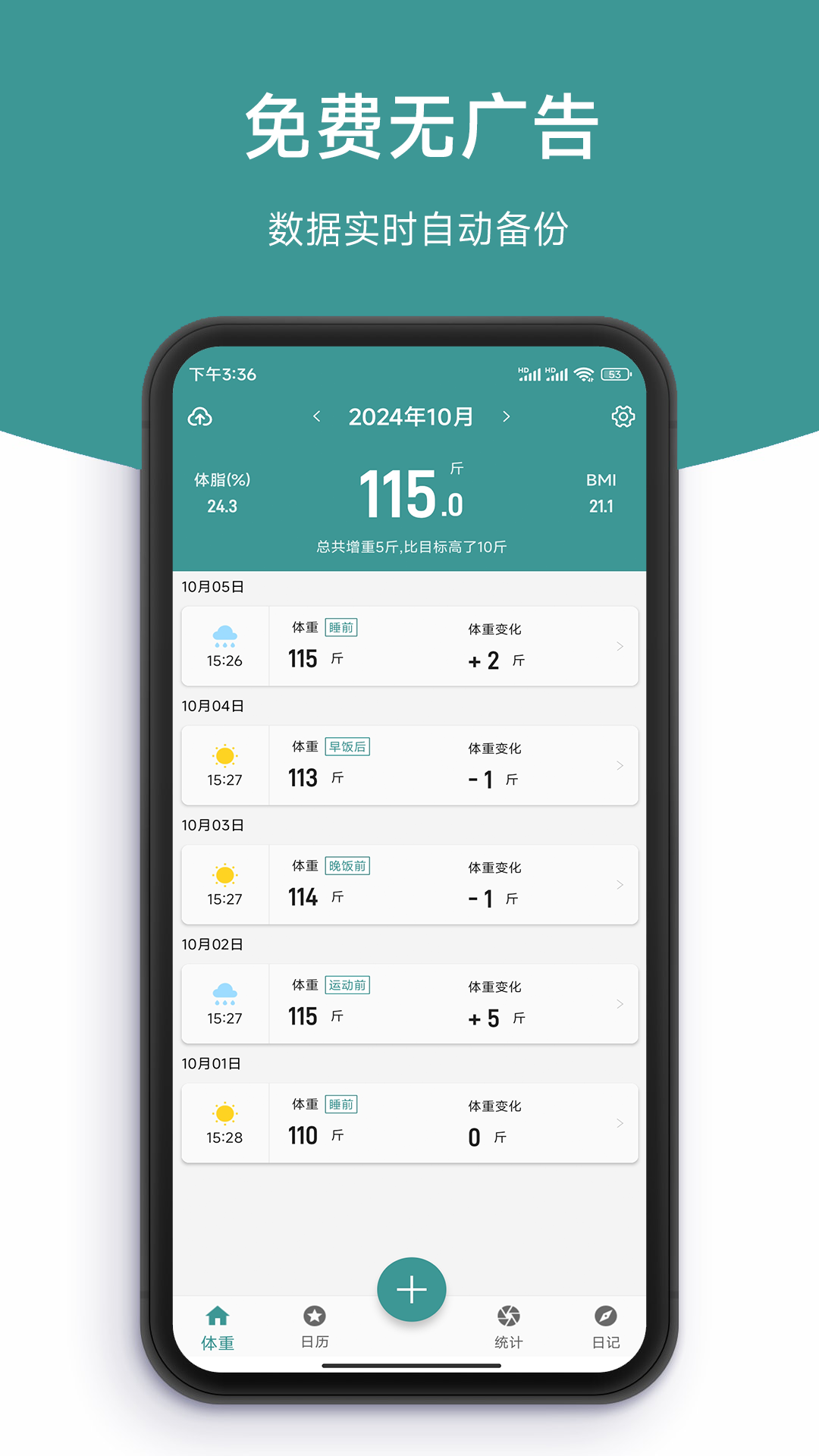 2 无论是减肥、增肌、保持体型,都可以为您记录下您的点点滴滴,体重日记愿与您一起成长。