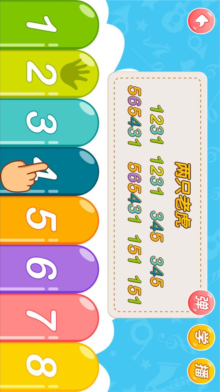 其三,七彩简谱,分小节演奏。宝宝熟练掌握1 - 8这几个阿拉伯数字后,按照小节提示进行演奏,就能成为小小音乐家。