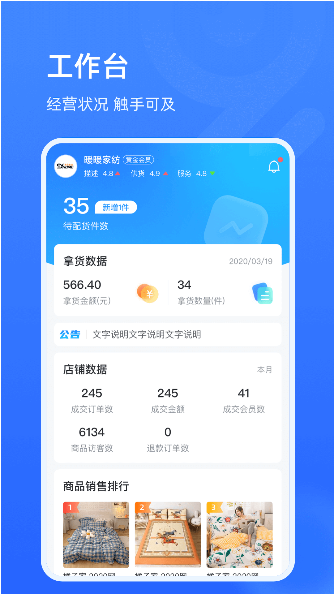 它具备诸多实用功能,像能让商家查阅公告通知,及时获取重要信息;对待配货情况可随时查看并持续跟进,因为配货消息会实时更新;成交订单、成交金额、成交会员等数据也能轻松查询,真正实现店铺数据随时随地一手掌控;还能查看访客统计,了解店铺流量情况;同时,退款退单信息也可查询;另外,联系专属业务员也很方便,只需一键召唤,业务员就会快速响应。