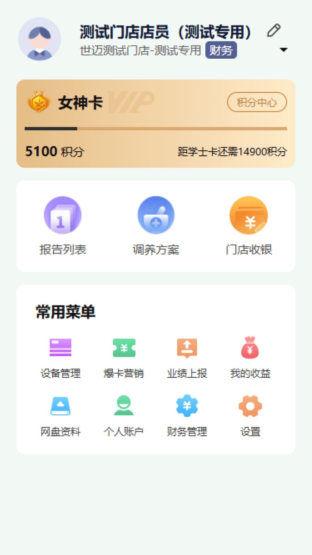 赋帮app包含积分管理,报告列表,调养方案,门店收银等功能,用于内部门店进行管理,学习
