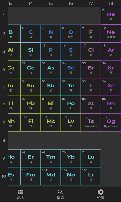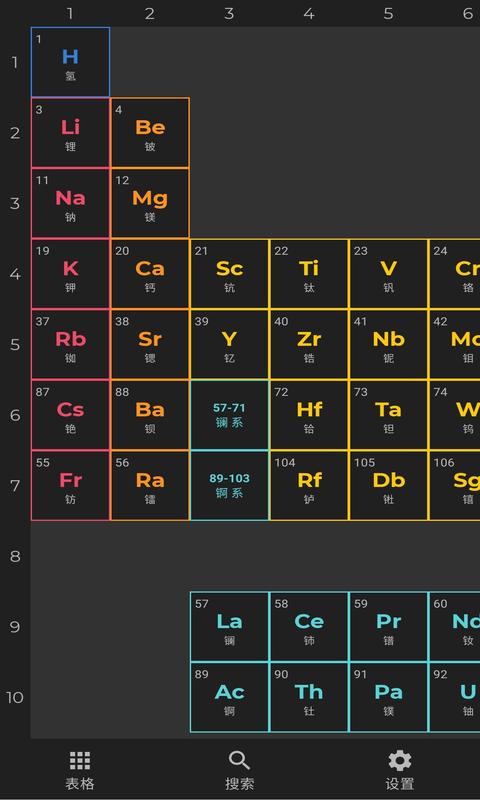 ●完整周期表呈现:软件主页面以炫酷且简约的界面展现完整的元素周期表,并且对镧系和锕系加以区分,点击对应的元素就能显示该元素更详细具体的信息。