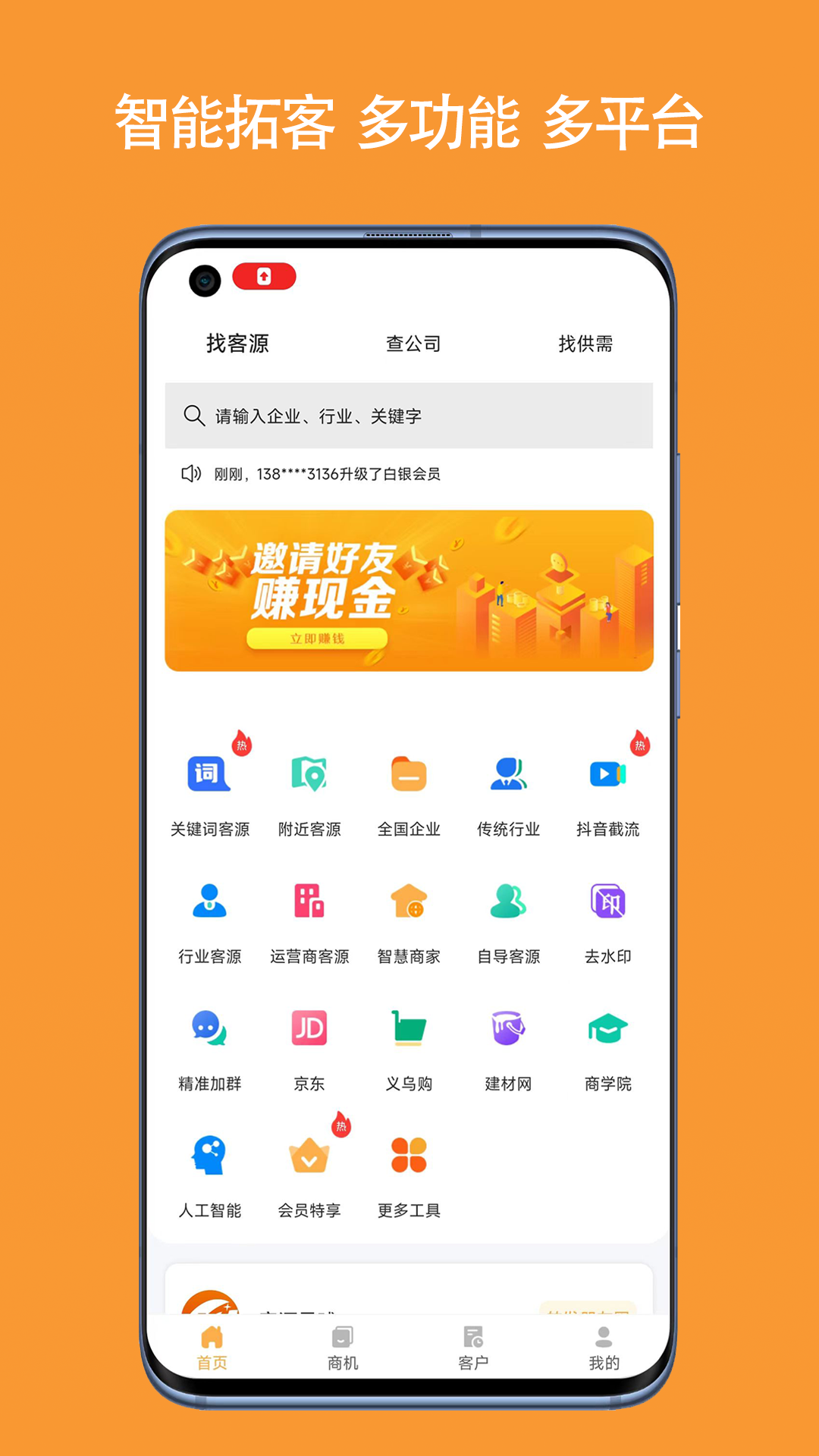 - 多种搜索功能:支持关键词搜索、附近搜索、行业搜索、同城搜索、美团搜索、抖音搜索等。通过这些搜索功能,可以轻松地搜寻到全国各省县市的商户、企业,涵盖80多个行业平台,还有短视频平台以及全国的行业群等各类资源。