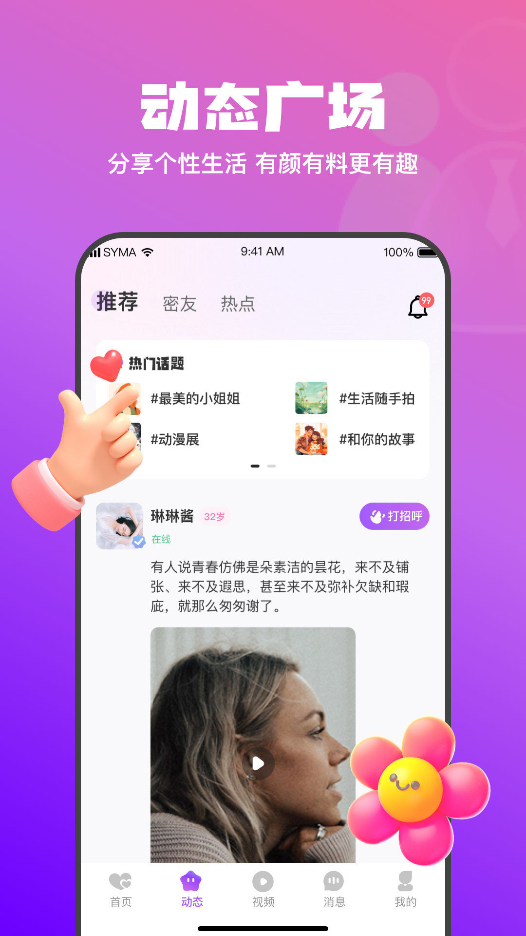 [实时动态]:分享充满个性的生活,展现有颜值、有内涵且趣味十足的自己。
