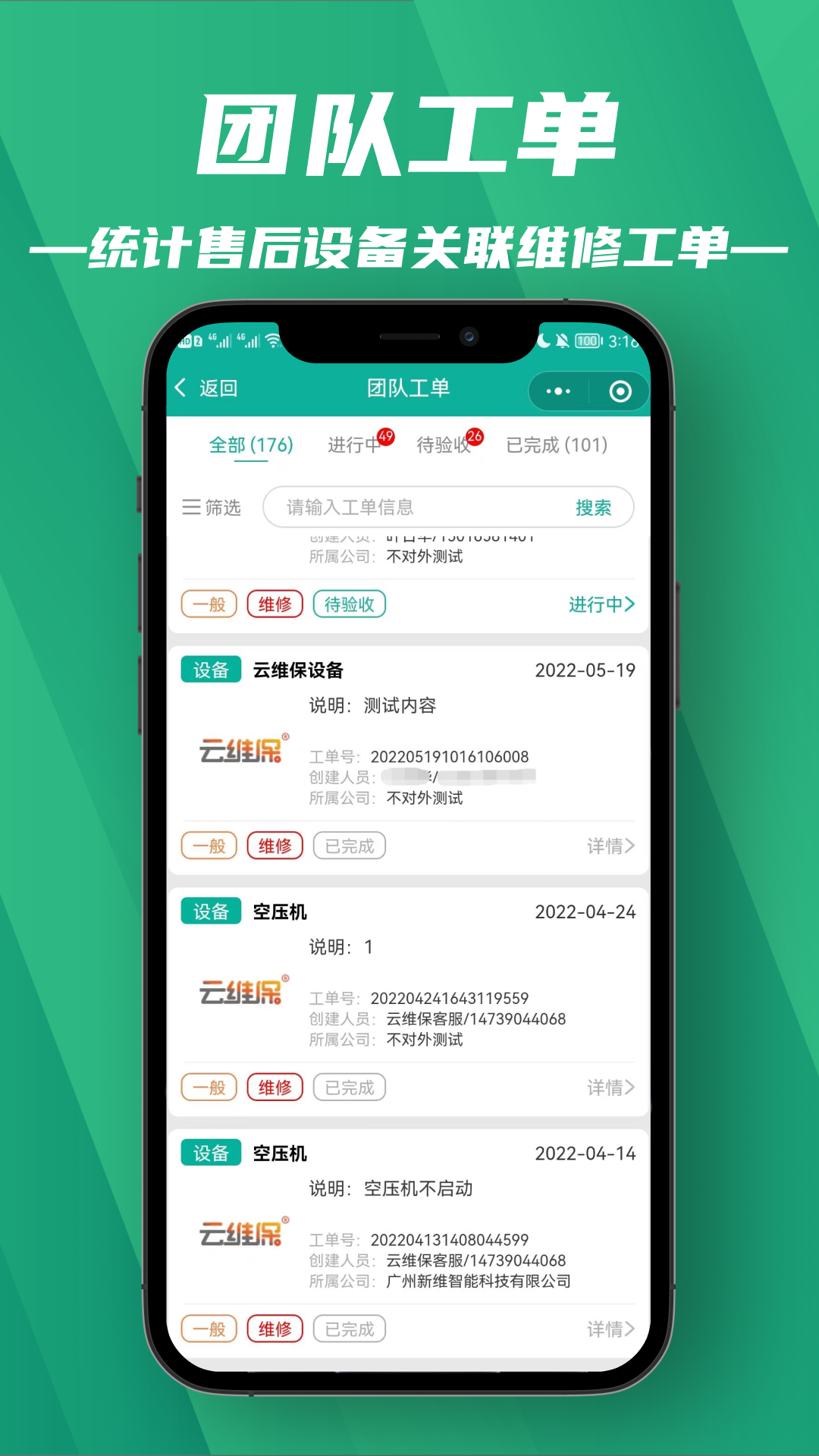 【掌握售后设备动态】为售后设备建立台账信息,赋予每台设备一个专属云维保二维码。