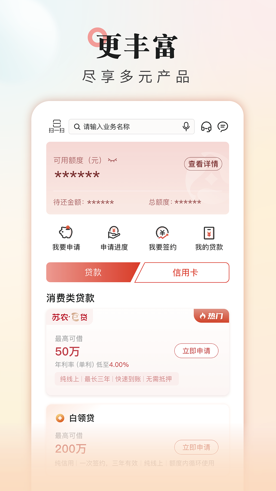 - **基础服务**:您可以查看账户一览、交易明细,进行智能转账、购买理财、办理智能储蓄、购买基金、申请个人贷款、使用信用卡、进行资金归集以及预约网点等。
