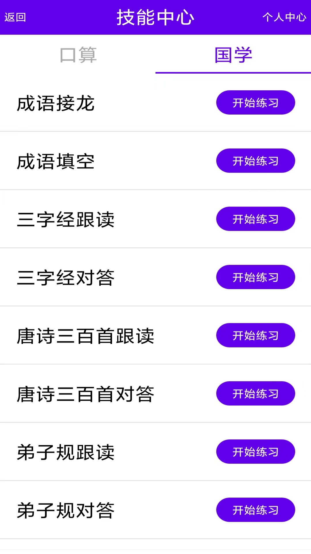 语音口算,这是一款依托大数据AI技术打造的少儿个性化练习册。它以语音交互为主要方式,从而实现练习的功能。其练习内容涵盖数学与国学的十多个专项练习,像数学中的十以内加减法、二十以内加减法、九九乘法表,国学范畴的成语接龙、《三字经》、《弟子规》以及古诗等内容都包含其中。