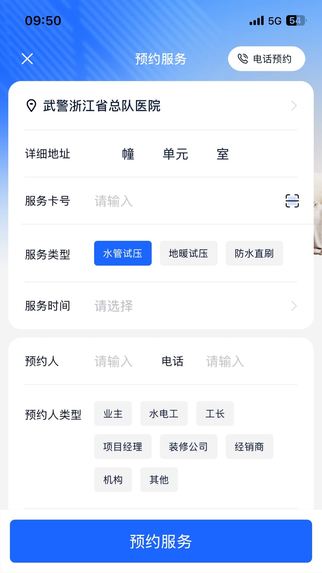 首页,业主可一键预约,新增快捷扫码预约方式,可预约水管试压、地暖试压、防水直刷服务