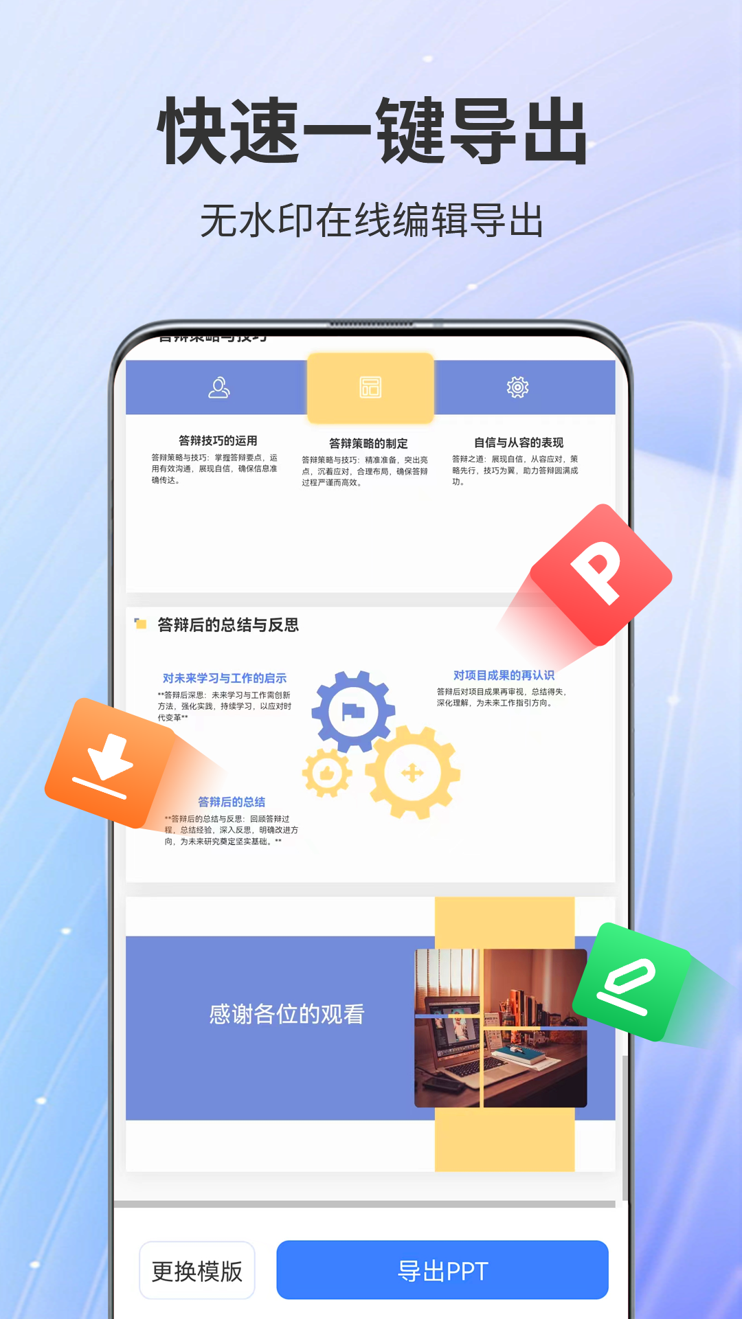 其五,软件支持一键导出PPT修改功能。借助这一功能,您能够轻松地将生成的PPT导出,以便进行进一步的修改与分享。