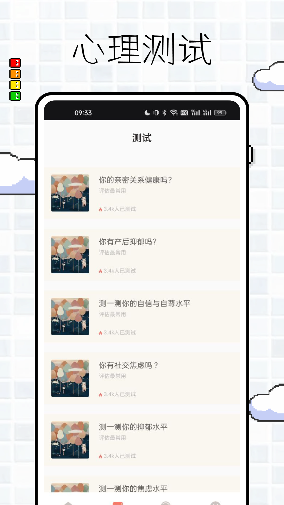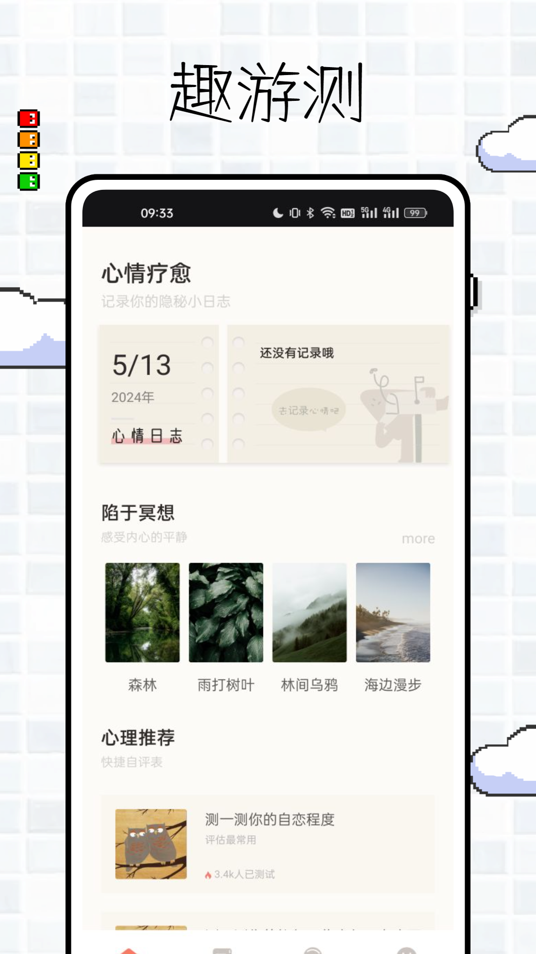 在趣游测里,您能够随时写下心情日志,尽情倾诉内心的情感。您还可以沉浸于冥想之中,静静聆听自然的声音,使心灵重归平静。它提供各类心理推荐测试题,涵盖产后抑郁、社交焦虑等多种方面,您可以借助这些测试深入地认识自己的心理状态。