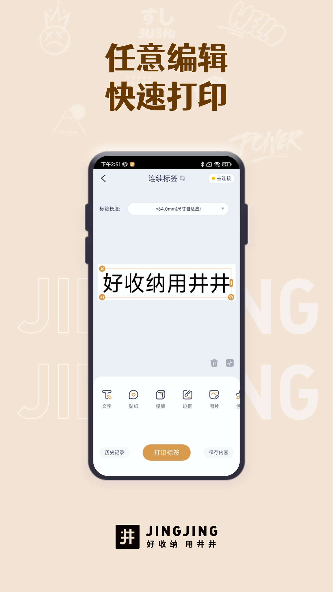 在标签制作方面,它可以连接井井标签机元气mini、艺术家miniHD等设备实现标签打印功能。生活中那些需要分类标识的标签都能打印,无论是对食物、药品还是化妆品的管理,都可以通过贴上包含开封日期、购买日期、过期时间等信息的标签,让全家人安心。为自己和家人的私人物品、专属用品、辅食保健品等贴上标识标签,也有助于守护家人的健康安全。而且,你能够从各式各样的字体、符号、边框、模板等当中进行选择,来设计标签,简单一贴就能让生活既有序又有趣。