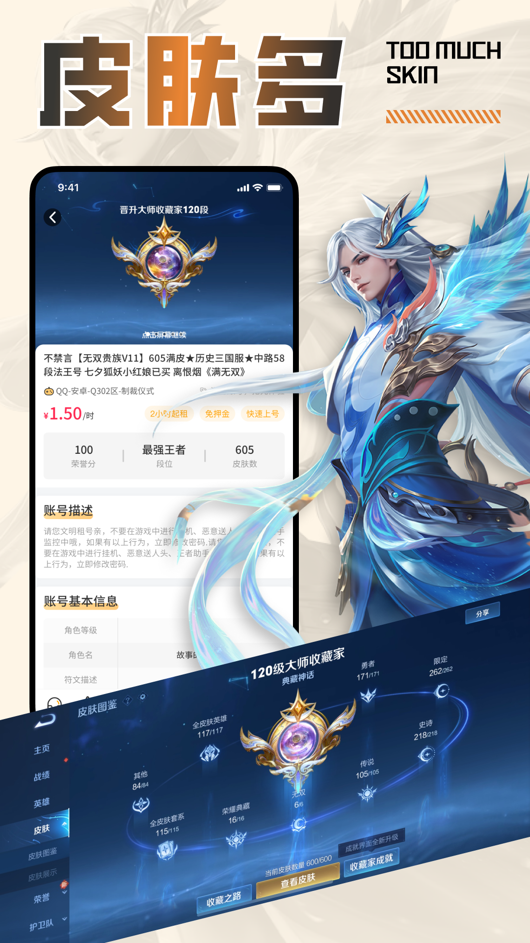 【号源充沛】百万量级的高氪金优质账号,皮肤多,段位高,英雄全,全区位覆盖,满足王者们对账号的所有需求。