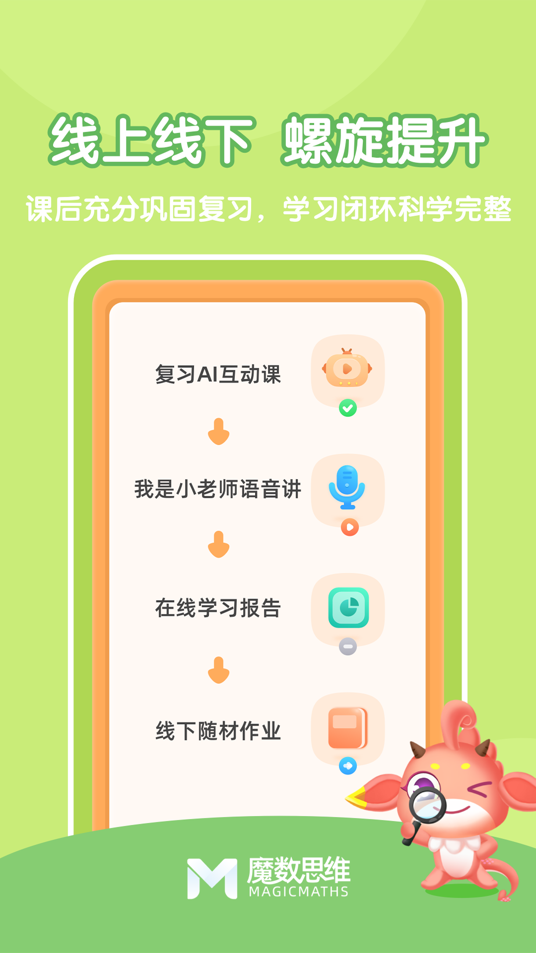 通过“学-固-讲-练-测”打造全新启智学习闭环:趣味课堂学-在线AI课复习——课后宝贝语音讲——配套纸质书本练,老师课堂点评、作业讲解,全面保障学习效果。