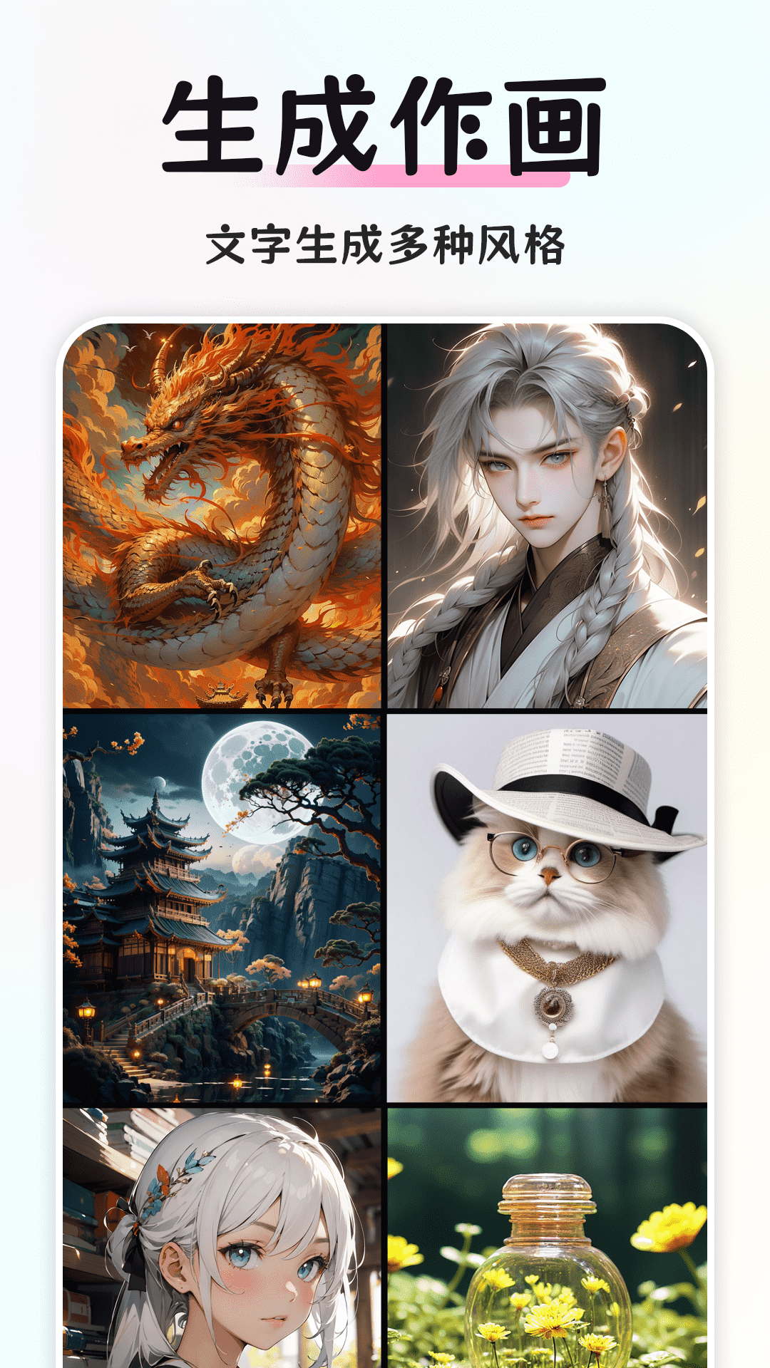 丰富的艺术风格:我们提供众多艺术风格,例如让梵高的风格来描绘二次元美少女、使蒙娜丽莎转变为古风美女风格、或是让宫崎骏以工笔画的形式还原哈尔的移动城堡等。每种画风都有其独特之处和特定氛围,能够让你精确找到自己想要的绘画风格。你无需具备绘画技巧,只要简单描述想法,就能看到专属自己的作品。