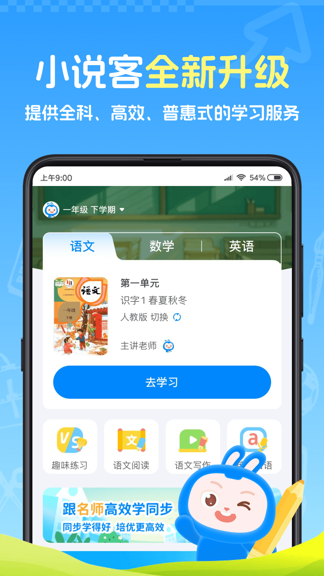 小说客是一款面向小学生自主同步学习的APP。它能与小学语文、数学、英语95%以上的主流教材实现同步匹配。这款APP有着20年的经验积累,其课程由100多位毕业于清华北大的名师以及一线名师负责教研,并且由这些老师真人授课。其中包含58000多个学习视频,还有150000多道同步训练试题。