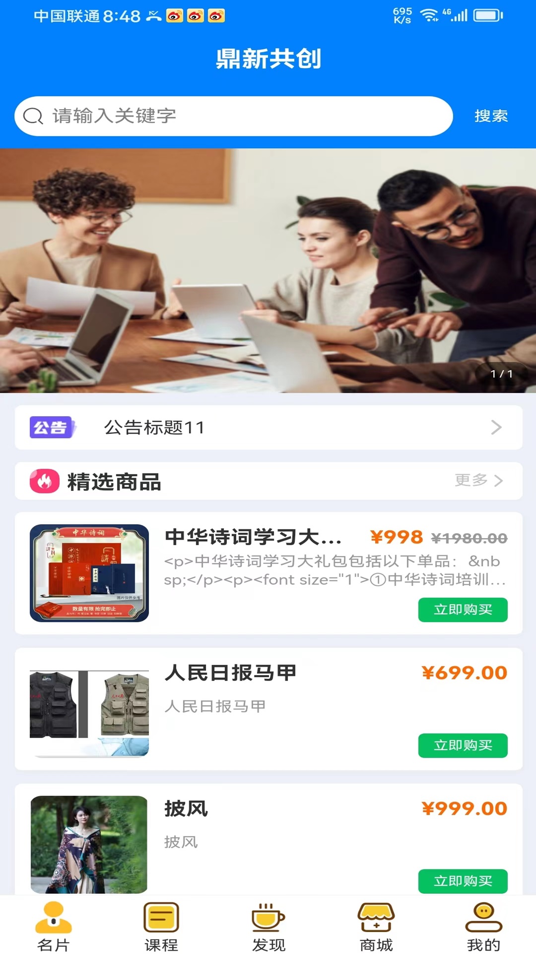 共创APP是一款聚焦于员工名片及商城相关功能的应用。其使用场景主要为员工个人名片的推广,在这个APP里包含了商城模块与企业文化内容。它具有便捷分享的功能,这有助于员工去拓展自己的客户资源。