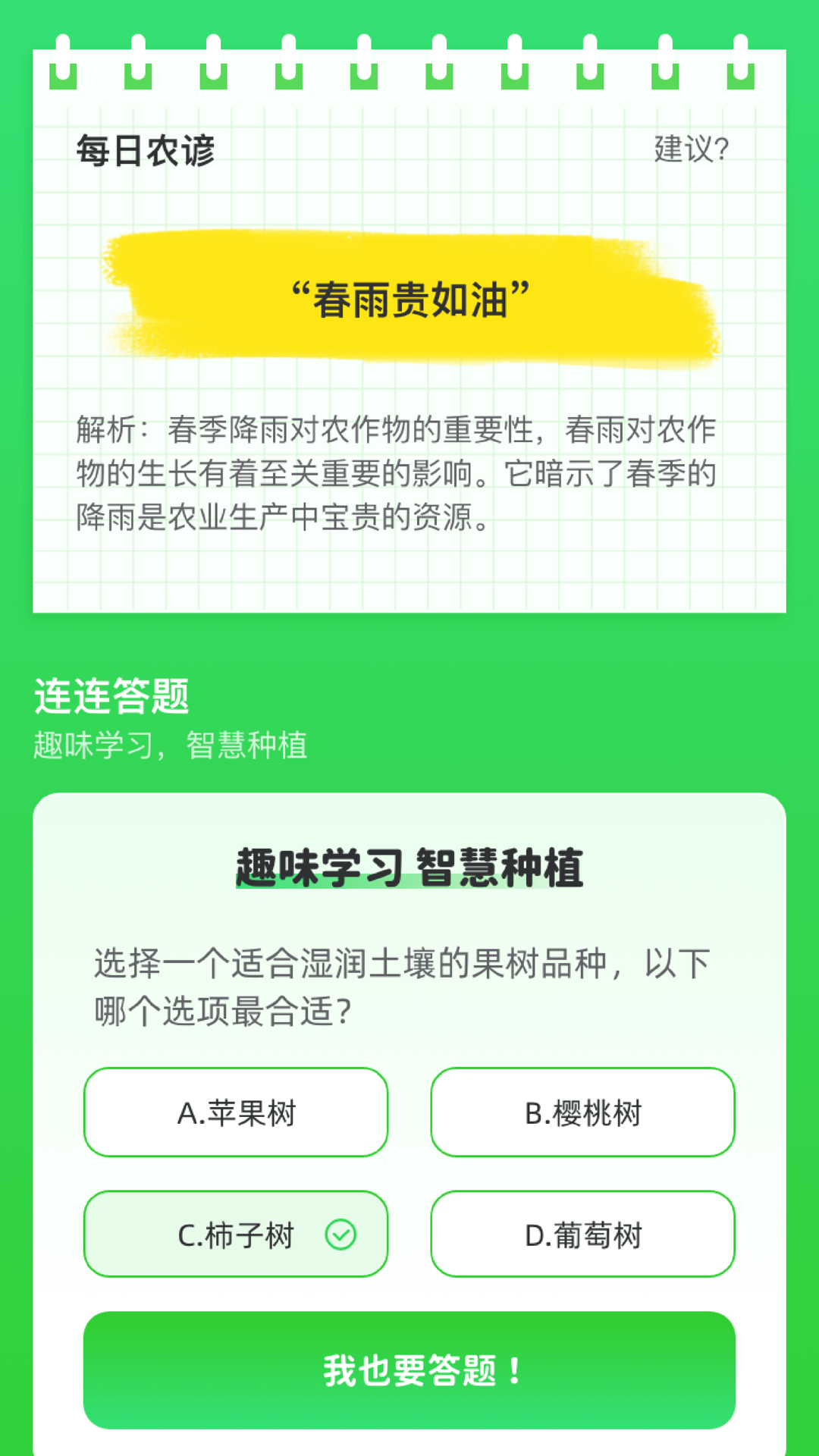 一连果树是一款与果树知识相关的工具类软件,具有果树种植指南,多种常见果树的详细的种植方法;以及连连答题,果树相关的知识答题,趣味学习,智慧种植,喜欢的话,快来试试吧!