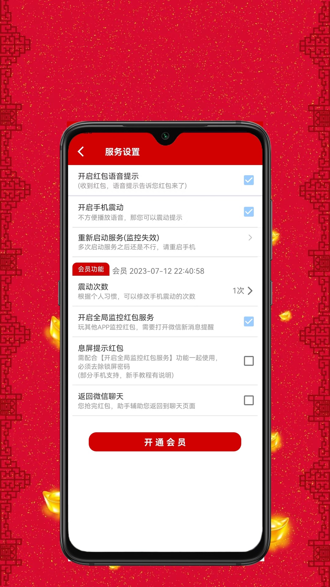 抢红包助手是一款APP,属于语音提醒工具类型。它的主要功能是语音提醒用户有红包到来,其定位在于协助用户应对不知道红包到来的情况。在日常生活中,用户可能会在刷视频或者购物的时候,由于注意力集中在当前事务上而无法知晓红包的到来,而这款APP就能够通过语音提醒用户红包来了。即使用户当时不在手机旁边,借助助手的语音提示,也能够快速找到红包所在之处。